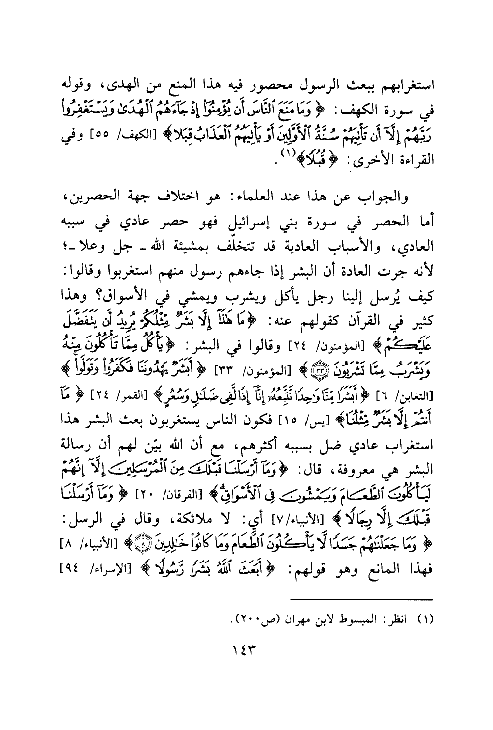 فهذا المانع وهو قولهم: <أبعث اله بشرا رسو،) [ا! سراء/ 94]