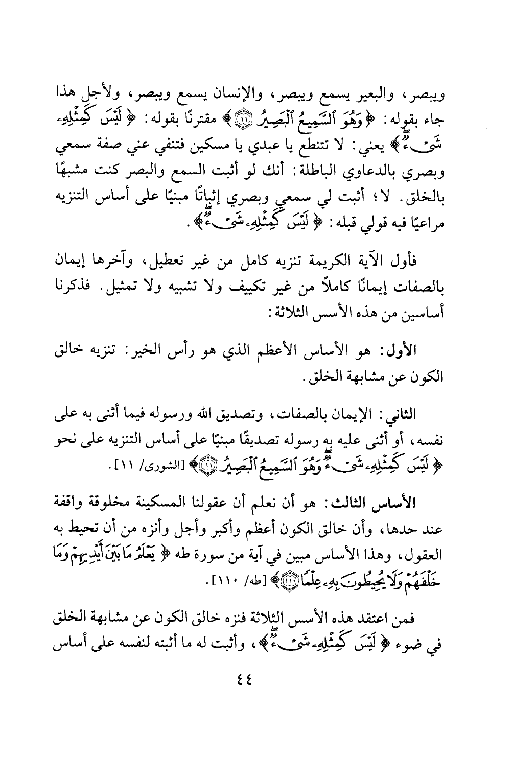 فمن اعتقد هذه الاسس الثلاثة فنزه خالق الكون عن مشابهة الخلق