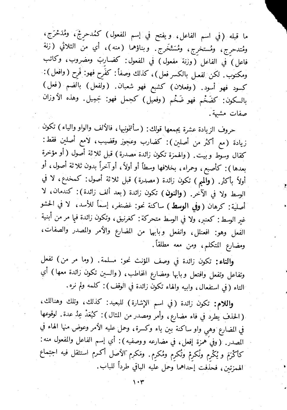 حُرُوف الزِّيَادَة عشرَة يجمعها قَوْلك سألتمونيها فالألف وَالْوَاو وَالْيَاء تكون زِيَادَة مَعَ أَكثر من أصلين كضارب وعجوز وقضيب لَا مَعَ أصلين فَقَط كقال وسوط وَبَيت والهمزة تكون زَائِدَة مصدرة قبل ثَلَاثَة أصُول أَو مؤخرة بعْدهَا كأصبع وحمراء بِخِلَافِهَا وسطا أَو أَولا أَو آخرا بِدُونِ ثَلَاثَة اصول أَو أَولا بِأَكْثَرَ وَالْمِيم تكون زَائِدَة مصدرة قبل ثَلَاثَة أصُول كمخدع لَا فِي الْوسط وَلَا فِي الآخر وَالنُّون تكون زَائِدَة بعد ألف زَائِدَة كندمان لَا أَصْلِيَّة كرهان وَفِي الْوسط سَاكِنة نَحْو غضنفر إسما للأسد لَا فِي الحشو غير الْوسط كعنبر وَلَا فِي الْوسط متحركة كغرنيق وَتَكون زَائِدَة فِيمَا مر من أبنية الْفِعْل وَهُوَ افعنلل وانفعل وبابهما من الْمُضَارع وَالْأَمر والمصدر وَالصِّفَات ومضارع الْمُتَكَلّم وَمن مَعَه مُطلقًا