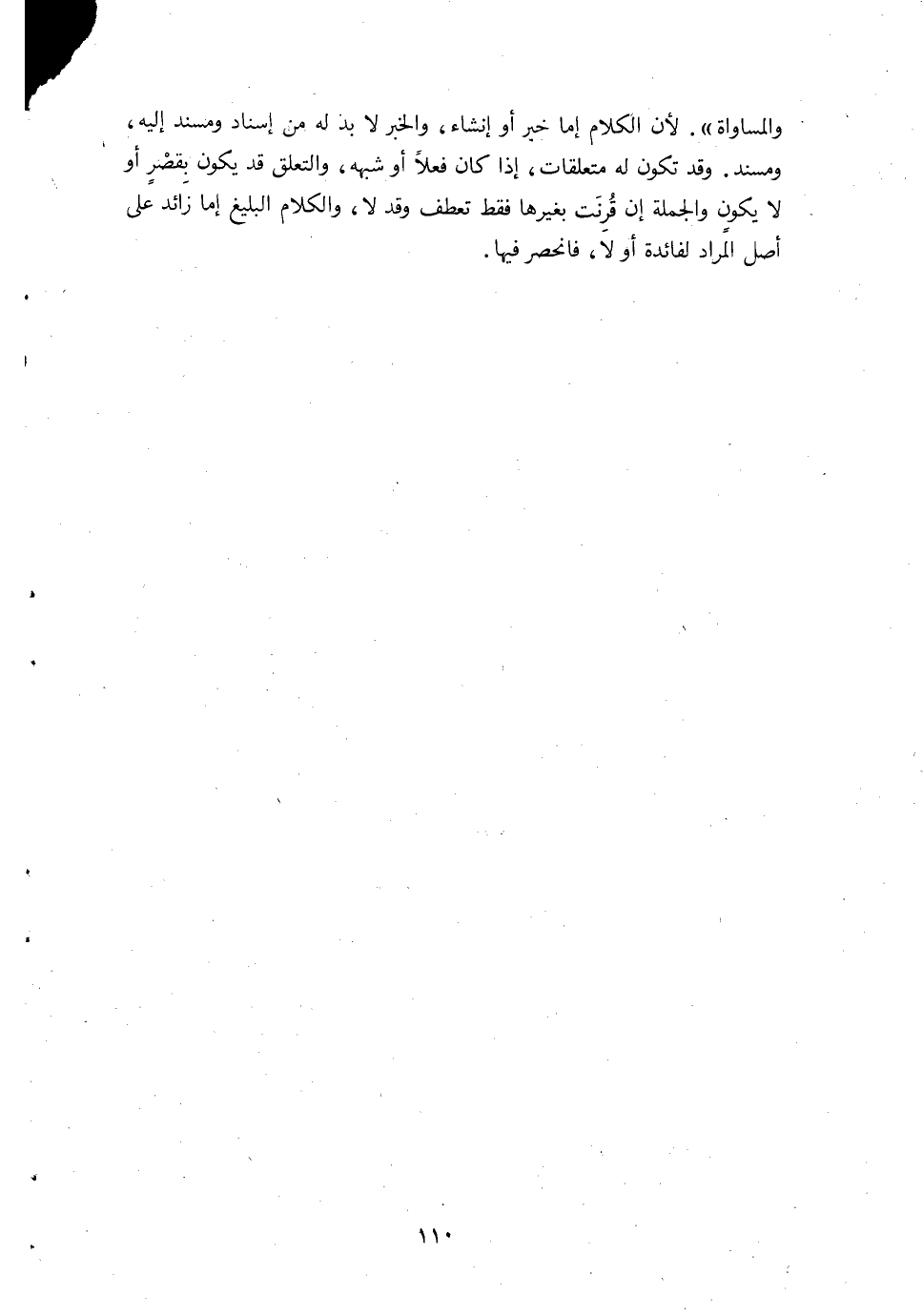 والمساواة لِأَن الْكَلَام إِمَّا خبر أَو إنْشَاء وَالْخَبَر لَا بُد لَهُ من إِسْنَاد ومسند إِلَيْهِ ومسند وَقد تكون لَهُ متعلقات إِذا كَانَ فعلا أَو شبهه والتعلق قد يكون بقصر أَو لَا يكون وَالْجُمْلَة إِن قرنت بغَيْرهَا فَقَط تعطف وَقد لَا وَالْكَلَام البليغ إِمَّا زَائِد على أصل المُرَاد لفائدة أَو لَا فانحصر فِيهَا