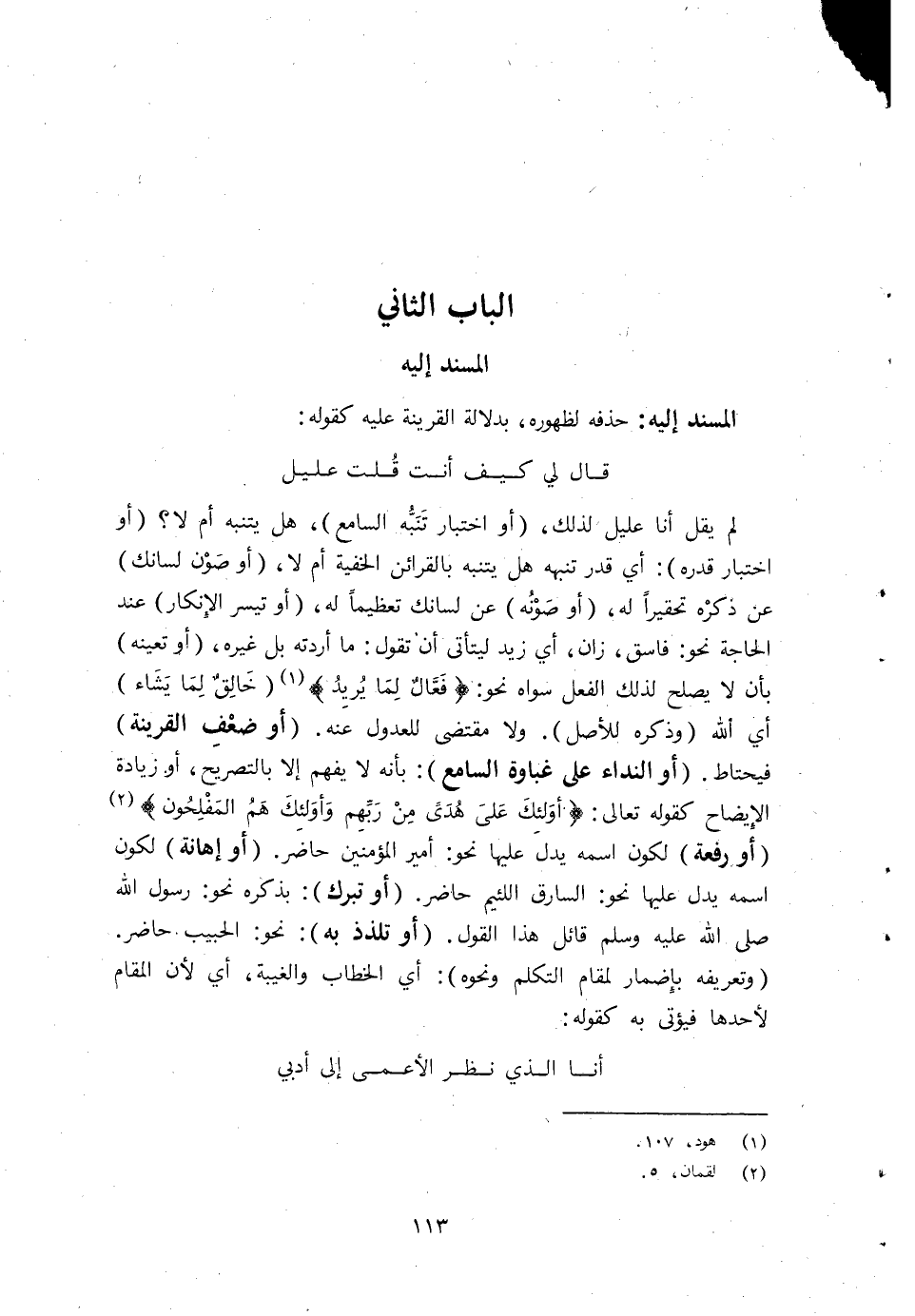 الْمسند إِلَيْهِ حذفه لظُهُوره بِدلَالَة الْقَرِينَة عَلَيْهِ كَقَوْلِه
