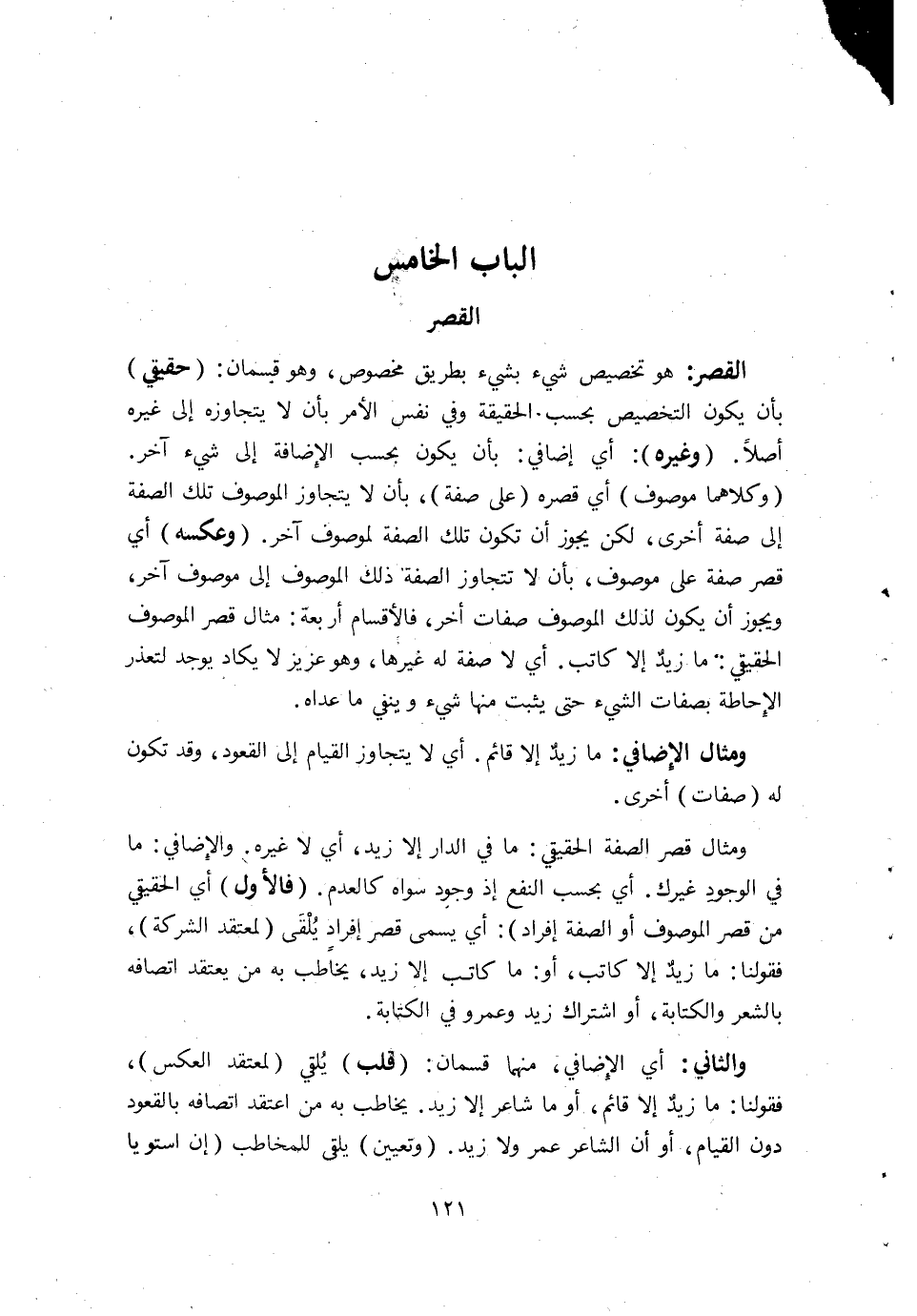 الْقصر هُوَ تَخْصِيص شَيْء بِشَيْء بطرِيق مَخْصُوص وَهُوَ قِسْمَانِ حَقِيقِيّ بِأَن يكون التَّخْصِيص بِحَسب الْحَقِيقَة وَفِي نفس الْأَمر بِأَن لَا يتجاوزه إِلَى غَيره أصلا وَغَيره أَي إضافي بِأَن يكون بِحَسب الْإِضَافَة إِلَى شَيْء آخر وَكِلَاهُمَا مَوْصُوف أَي قصره على صفة بِأَن لَا يتَجَاوَز الْمَوْصُوف تِلْكَ الصّفة إِلَى صفة أُخْرَى لَكِن يجوز أَن تكون تِلْكَ الصّفة لموصوف آخر وَعَكسه أَي قصر صفة على مَوْصُوف بِأَن لَا تتجاوز الصّفة ذَلِك الْمَوْصُوف إِلَى مَوْصُوف آخر وَيجوز أَن يكون لذَلِك الْمَوْصُوف صِفَات أخر فالأقسام أَرْبَعَة مِثَال قصر الْمَوْصُوف الْحَقِيقِيّ مَا زيد إِلَّا كَاتب أَي لَا صفة لَهُ غَيرهَا وَهُوَ عَزِيز لَا يكَاد يُوجد لتعذر الْإِحَاطَة بِصِفَات الشَّيْء حَتَّى يثبت مِنْهَا شَيْء وينفي مَا عداهُ