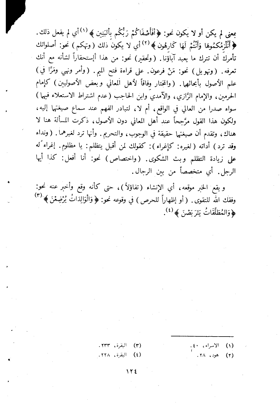 بِمَعْنى لم يكن أَو لَا يكون نَحْو {أفأصفاكم ربكُم بالبنين} أَي لم يفعل ذَلِك {أنلزمكموها وَأَنْتُم لَهَا كَارِهُون} أَي لَا يكون ذَلِك وتهكم نَحْو أصلواتك تأمرك أَن تتْرك مَا يعبد آبَاؤُنَا وتحقير نَحْو من هَذَا أإستحقارا لشأنه مَعَ أَنَّك تعرفه وتهويل نَحْو من فِرْعَوْن على قِرَاءَة فتح الْمِيم وَأمر وَنهي وَمَرا فِي علم الْأُصُول بأبحاثهما وَالْمُخْتَار وفَاقا لأهل الْمعَانِي وَبَعض الْأُصُولِيِّينَ كإمام الْحَرَمَيْنِ وَالْإِمَام الرَّازِيّ والآمدي وَابْن الْحَاجِب عدم اشْتِرَاط الاستعلاء فيهمَا سَوَاء صَدرا من العالي فِي الْوَاقِع أم لَا لتبادر الْفَهم عِنْد سَماع صيغتهما إِلَيْهِ وَلكَون هَذَا القَوْل مرجحا عِنْد أهل الْمعَانِي دون الْأُصُول ذكرت الْمَسْأَلَة هُنَا لَا هُنَاكَ وَتقدم أَن صيغتهما حَقِيقَة فِي الْوُجُوب وَالتَّحْرِيم وَأَنَّهَا ترد لغَيْرِهِمَا ونداء وَقد ترد أداته لغيره كإغراء كَقَوْلِك لمن أقبل يتظلم يَا مظلوم إغراء لَهُ على زِيَادَة التظلم وَبث الشكوى واختصاص نَحْو أَنا أفعل كَذَا أَيهَا الرجل أَي متخصصا من بَين الرِّجَال