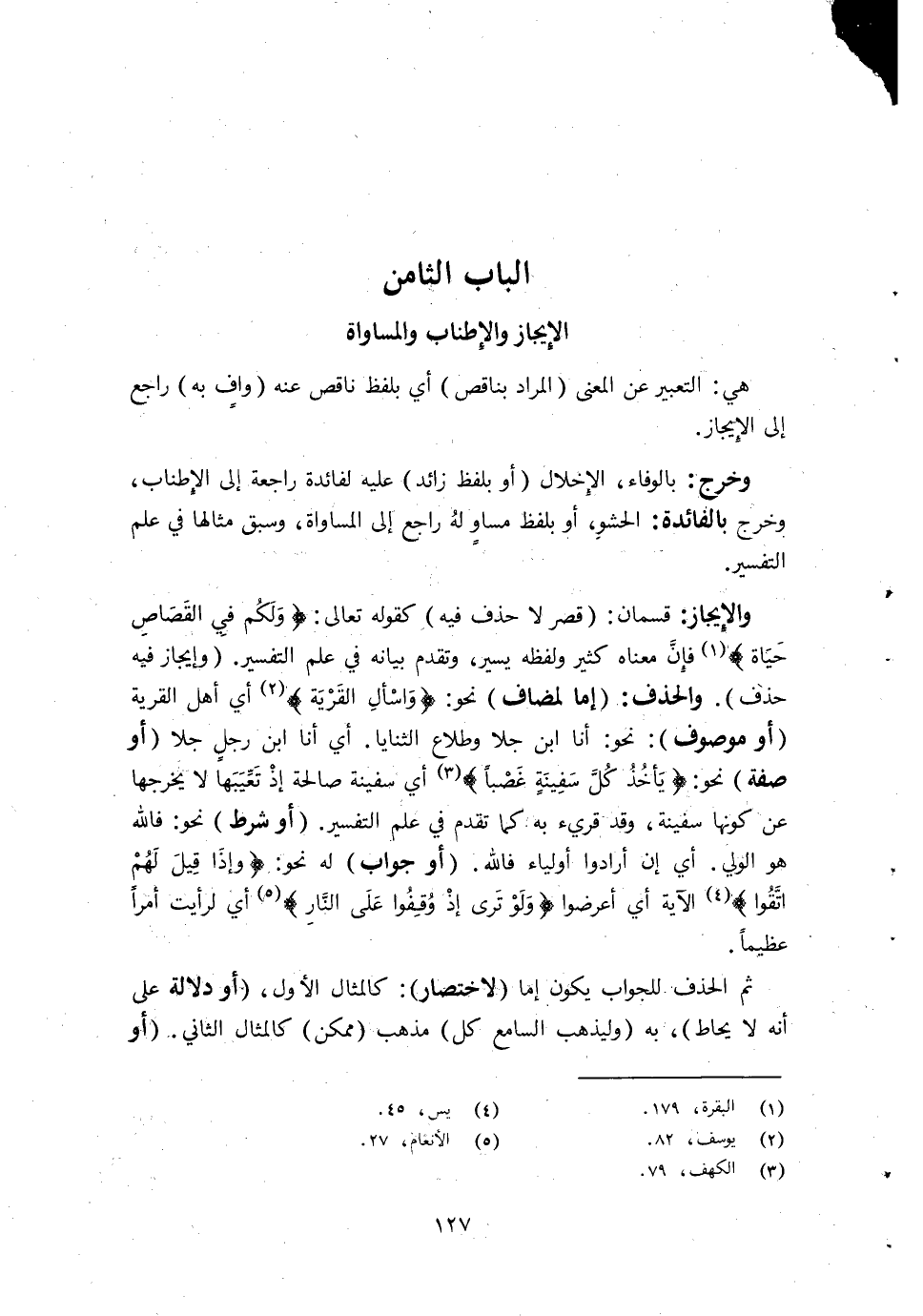 والإيجاز قِسْمَانِ قصر لَا حذف فِيهِ كَقَوْلِه تَعَالَى {وَلكم فِي الْقصاص حَيَاة} فَإِن مَعْنَاهُ كثير وَلَفظه يسير وَتقدم بَيَانه فِي علم التَّفْسِير وإيجاز فِيهِ حذف والحذف إِمَّا لمضاف نَحْو {واسأل الْقرْيَة} أَي أهل الْقرْيَة أَو مَوْصُوف نَحْو أَنا ابْن جلا وطلاع الثنايا أَي أَنا ابْن رجل جلا أَو صفة نَحْو {يَأْخُذ كل سفينة غصبا} أَي سفينة صَالِحَة إِذْ تعيبها لَا يُخرجهَا عَن كَونهَا سفينة وَقد قريء بِهِ كَمَا تقدم فِي علم التَّفْسِير أَو شَرط نَحْو فَالله هُوَ الْوَلِيّ أَي إِن أَرَادوا أَوْلِيَاء فَالله أَو جَوَاب لَهُ نَحْو {وَإِذا قيل لَهُم اتَّقوا} الْآيَة أَي أَعرضُوا {وَلَو ترى إِذْ وقفُوا على النَّار} أَي لرأيت أمرا عَظِيما
