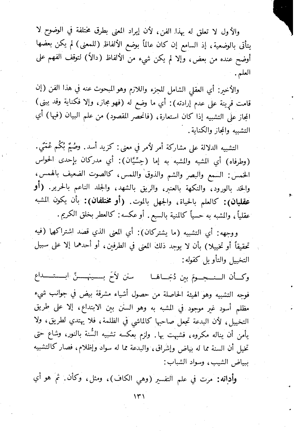 التَّشْبِيه الدّلَالَة على مُشَاركَة أَمر لأمر فِي معنى كزيد أَسد وصم بكم عمي وطرفاه أَي الْمُشبه والمشبه بِهِ إِمَّا حسيان أَي مدركان بِإِحْدَى الْحَواس الْخمس السّمع وَالْبَصَر والشم والذوق واللمس كالصوت الضَّعِيف بالهمس والخد بالورود والنكهة بالعنبر والريق بالشهد وَالْجَلد الناعم بالحرير أَو عقليان كَالْعلمِ بِالْحَيَاةِ وَالْجهل بِالْمَوْتِ أَو مُخْتَلِفَانِ بِأَن يكون الْمُشبه عقليا والمشبه بِهِ حسيا كالمنية بالسبع أَو عَكسه كالعطر بِخلق الْكَرِيم