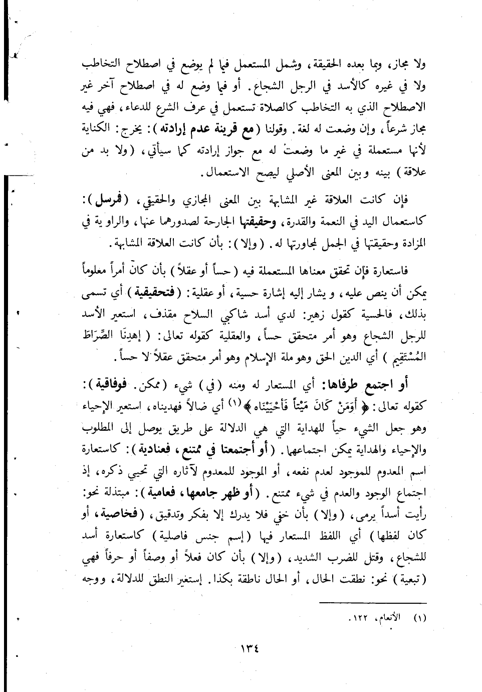 أَو اجْتمع طرفاها أَي الْمُسْتَعَار لَهُ وَمِنْه فِي شَيْء مُمكن فوفاقية كَقَوْلِه تَعَالَى {أَو من كَانَ مَيتا فأحييناه} أَي ضَالًّا فهديناه استعير الْإِحْيَاء وَهُوَ جعل الشَّيْء حَيا للهداية الَّتِي هِيَ الدّلَالَة على طَرِيق يُوصل إِلَى الْمَطْلُوب والإحياء وَالْهِدَايَة يُمكن اجْتِمَاعهمَا أَو أجتمعتا فِي مُمْتَنع فعنادية كاستعارة اسْم الْمَعْدُوم للموجود لعدم نَفعه أَو الْمَوْجُود للمعدوم لآثاره الَّتِي تحيي ذكره إِذْ اجْتِمَاع الْوُجُود والعدم فِي شَيْء مُمْتَنع أَو ظهر جَامعهَا فعامية مبتذلة نَحْو رَأَيْت أسدا يرْمى وَإِلَّا بِأَن خَفِي فَلَا يدْرك إِلَّا بفكر وتدقيق فخاصية أَو كَانَ لَفظهَا أَي اللَّفْظ الْمُسْتَعَار فِيهَا إسم جنس فاصلية كاستعارة أَسد للشجاع وَقتل للضرب الشَّديد وَإِلَّا بِأَن كَانَ فعلا أَو وَصفا أَو حرفا فَهِيَ تَبَعِيَّة نَحْو نطقت الْحَال أَو الْحَال ناطقة بِكَذَا إستعير النُّطْق للدلالة وَوجه