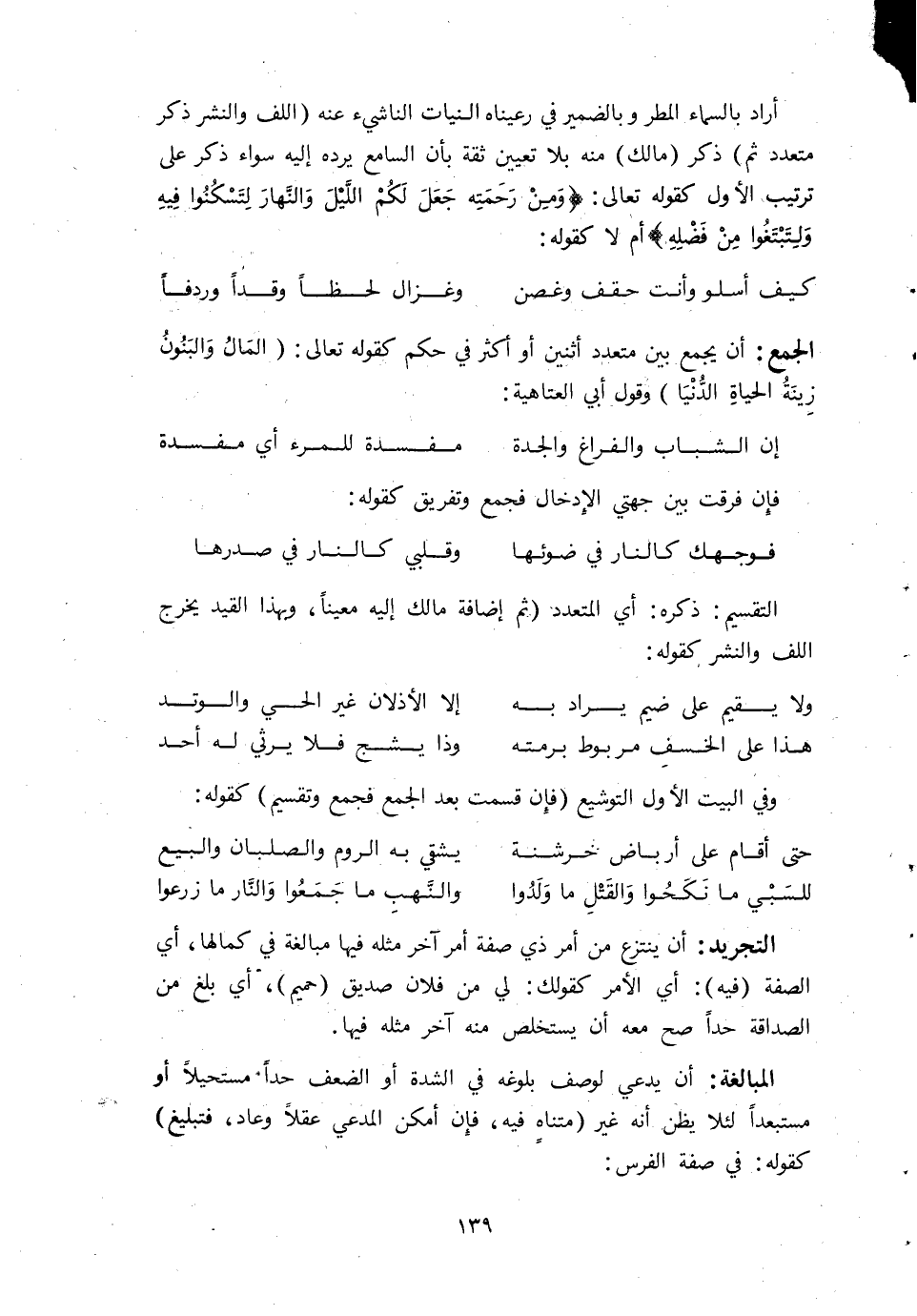 التَّقْسِيم ذكره أَي المتعدد ثمَّ إِضَافَة مَالك إِلَيْهِ معينا وَبِهَذَا الْقَيْد يخرج اللف والنشر كَقَوْلِه
