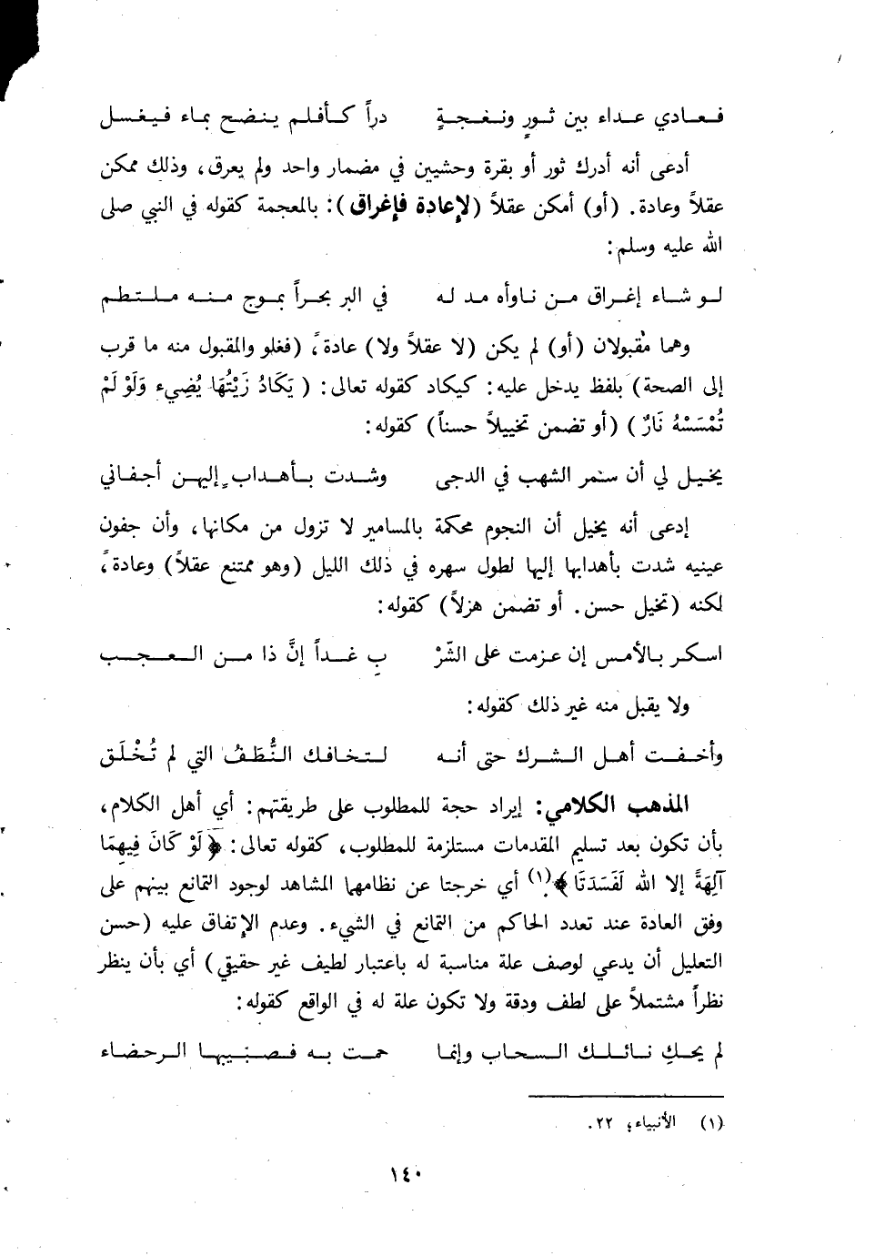 الْمَذْهَب الكلامي إِيرَاد حجَّة للمطلوب على طريقتهم أَي أهل الْكَلَام بِأَن تكون بعد تَسْلِيم الْمُقدمَات مستلزمة للمطلوب كَقَوْلِه تَعَالَى {لَو كَانَ فيهمَا آلِهَة إِلَّا الله لفسدتا} أَي خرجتا عَن نظامهما الْمشَاهد لوُجُود التمانع بَينهم على وفْق الْعَادة عِنْد تعدد الْحَاكِم من التمانع فِي الشَّيْء وَعدم الإتفاق عَلَيْهِ حسن التَّعْلِيل أَن يَدعِي لوصف عِلّة مُنَاسبَة لَهُ بِاعْتِبَار لطيف غير حَقِيقِيّ أَي بِأَن ينظر نظرا مُشْتَمِلًا على لطف ودقة وَلَا تكون عِلّة لَهُ فِي الْوَاقِع كَقَوْلِه