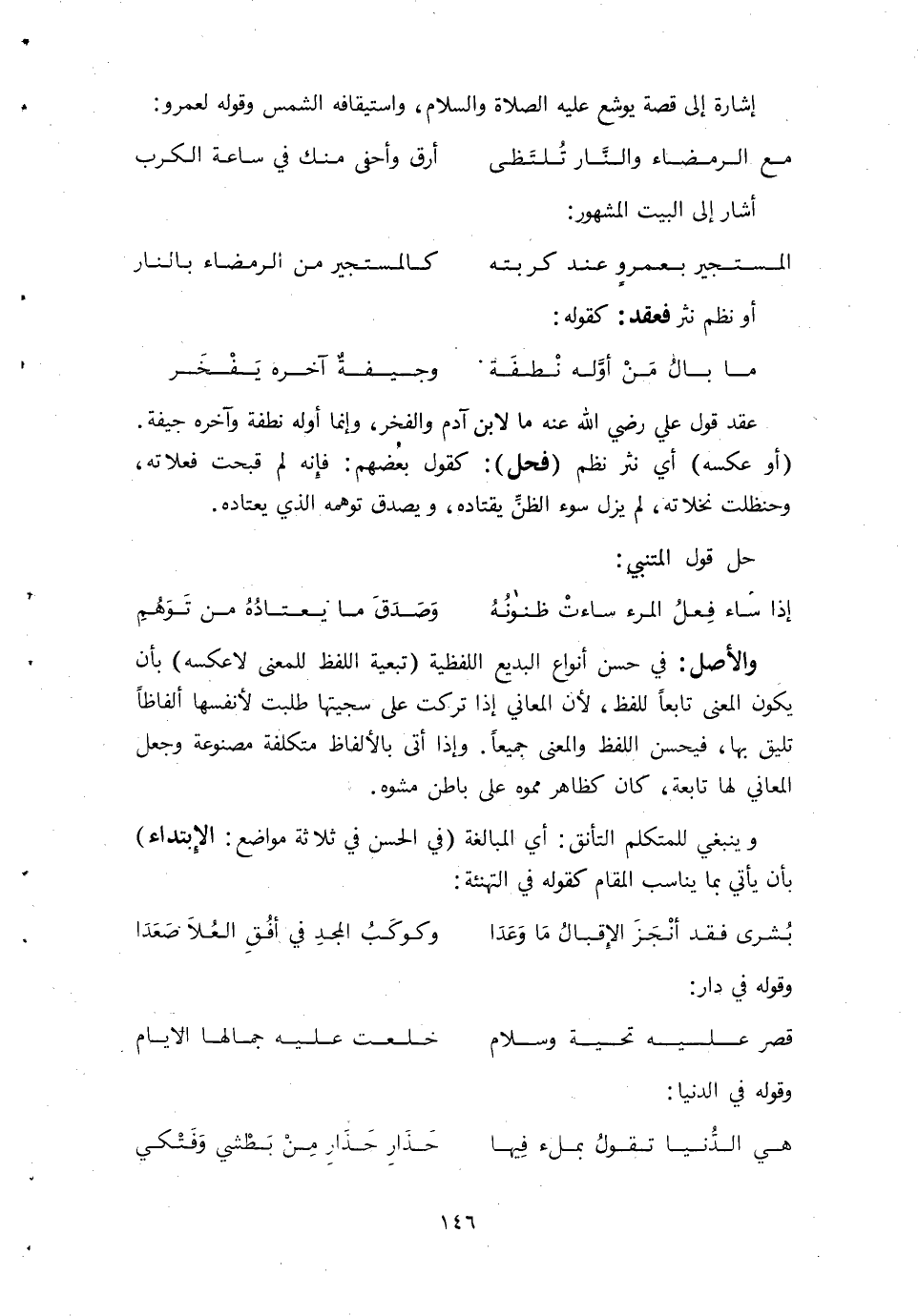 وَيَنْبَغِي للمتكلم التأنق أَي الْمُبَالغَة فِي الْحسن فِي ثَلَاثَة مَوَاضِع الإبتداء بِأَن يَأْتِي بِمَا يُنَاسب الْمقَام كَقَوْلِه فِي التهنئة