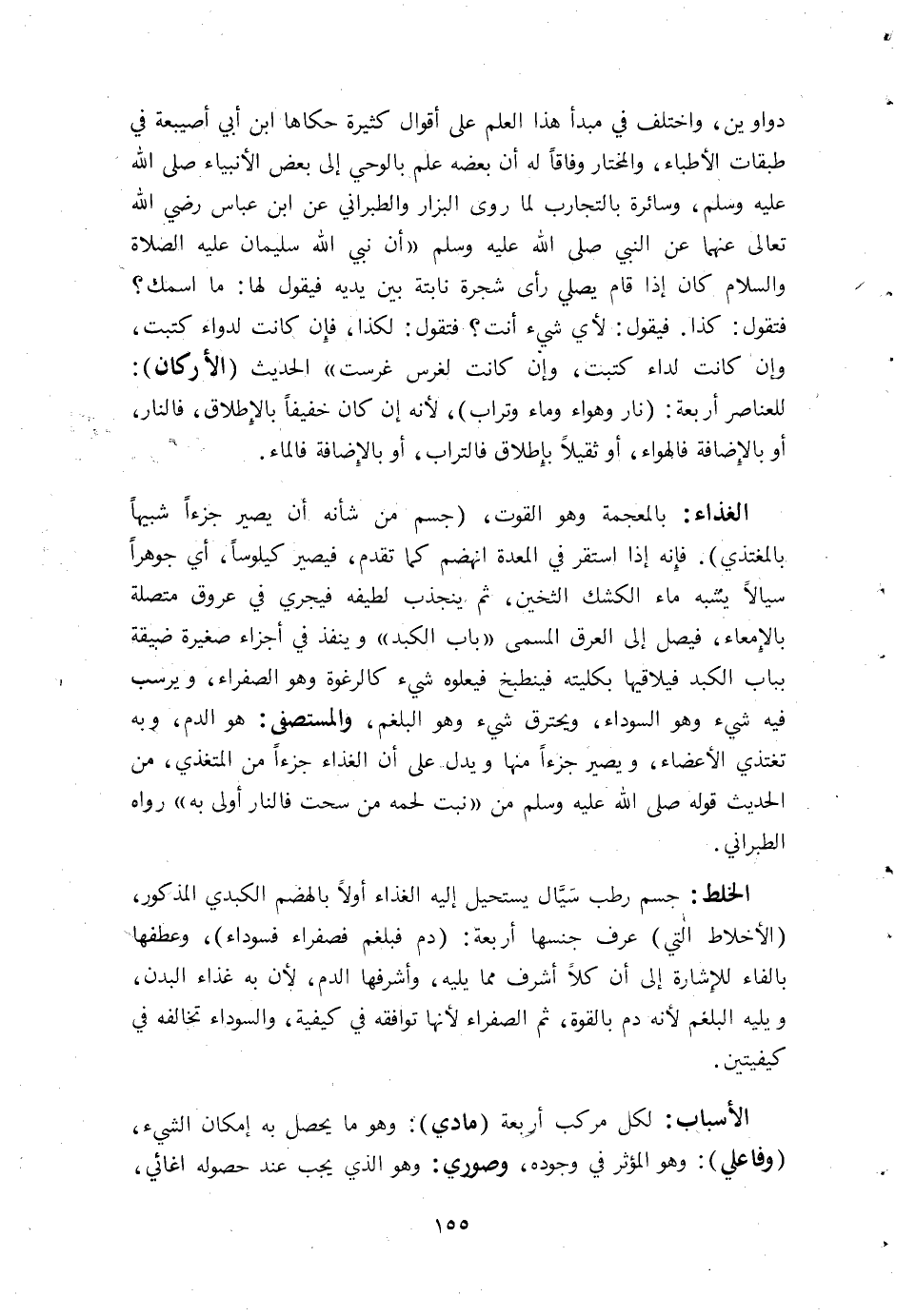 دواوين وَاخْتلف فِي مبدأ هَذَا الْعلم على أَقْوَال كَثِيرَة حَكَاهَا ابْن أبي أصيبعة فِي طَبَقَات الْأَطِبَّاء وَالْمُخْتَار وفَاقا لَهُ أَن بعضه علم بِالْوَحْي إِلَى بعض الْأَنْبِيَاء صلى الله عَلَيْهِ وَسلم وسائرة بالتجارب لما روى الْبَزَّار وَالطَّبَرَانِيّ عَن ابْن عَبَّاس رَضِي الله تَعَالَى عَنْهُمَا عَن النَّبِي صلى الله عَلَيْهِ وَسلم أَن نَبِي الله سُلَيْمَان عَلَيْهِ الصَّلَاة وَالسَّلَام كَانَ إِذا قَامَ يُصَلِّي رأى شَجَرَة نابتة بَين يَدَيْهِ فَيَقُول لَهَا مَا اسْمك فَتَقول كَذَا فَيَقُول لأي شَيْء أَنْت فَتَقول لكذا فَإِن كَانَت لدواء كتبت وَإِن كَانَت لداء كتبت وَإِن كَانَت لغرس غرست الحَدِيث الْأَركان للعناصر أَرْبَعَة نَار وهواء وَمَاء وتراب لِأَنَّهُ إِن كَانَ خَفِيفا بِالْإِطْلَاقِ فَالنَّار أَو بِالْإِضَافَة فالهواء أَو ثقيلا بِإِطْلَاق فالتراب أَو بِالْإِضَافَة فالماء