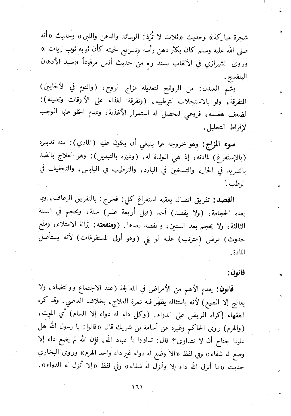 قانون يقدم الأهم من الْأَمْرَاض فِي المعالجة عِنْد الِاجْتِمَاع ووالتضاد وَلَا يعالج إِلَّا الْمُطِيع لِأَنَّهُ بامتثاله يظْهر فِيهِ ثَمَرَة العلاج بِخِلَاف العَاصِي وَقد كره الْفُقَهَاء إِكْرَاه الْمَرِيض على الدَّوَاء وكل دَاء لَهُ دَوَاء إِلَّا السام أَي الْمَوْت والهرم روى الْحَاكِم وَغَيره عَن أُسَامَة بن شريك قَالَ