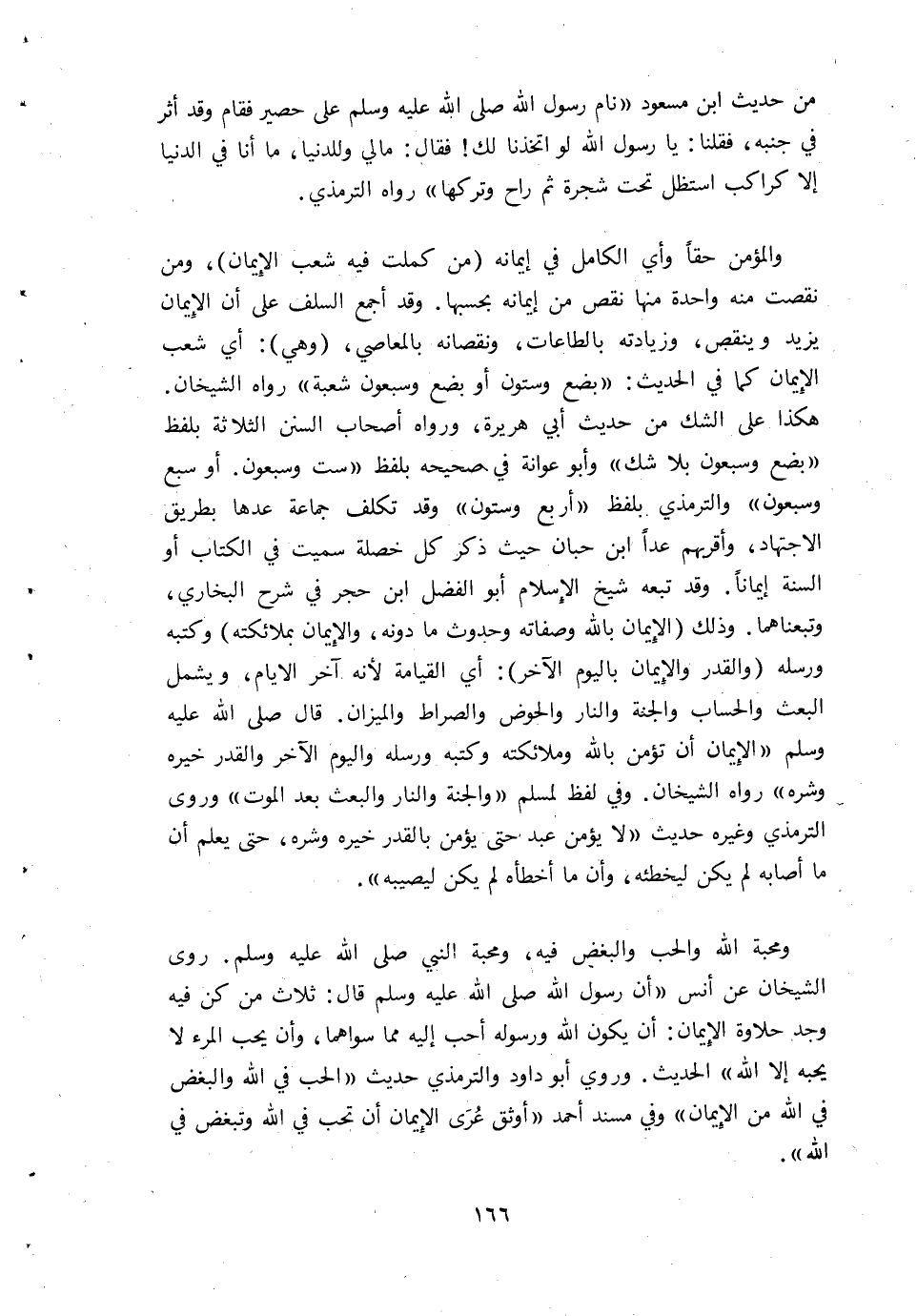 أَن رَسُول الله صلى الله عَلَيْهِ وَسلم قَالَ ثَلَاث من كن فِيهِ وجد حلاوة الْإِيمَان أَن يكون الله وَرَسُوله أحب إِلَيْهِ مِمَّا سواهُمَا وَأَن يحب الْمَرْء لَا يُحِبهُ إِلَّا الله الحَدِيث وَرُوِيَ أَبُو دَاوُد وَالتِّرْمِذِيّ حَدِيث