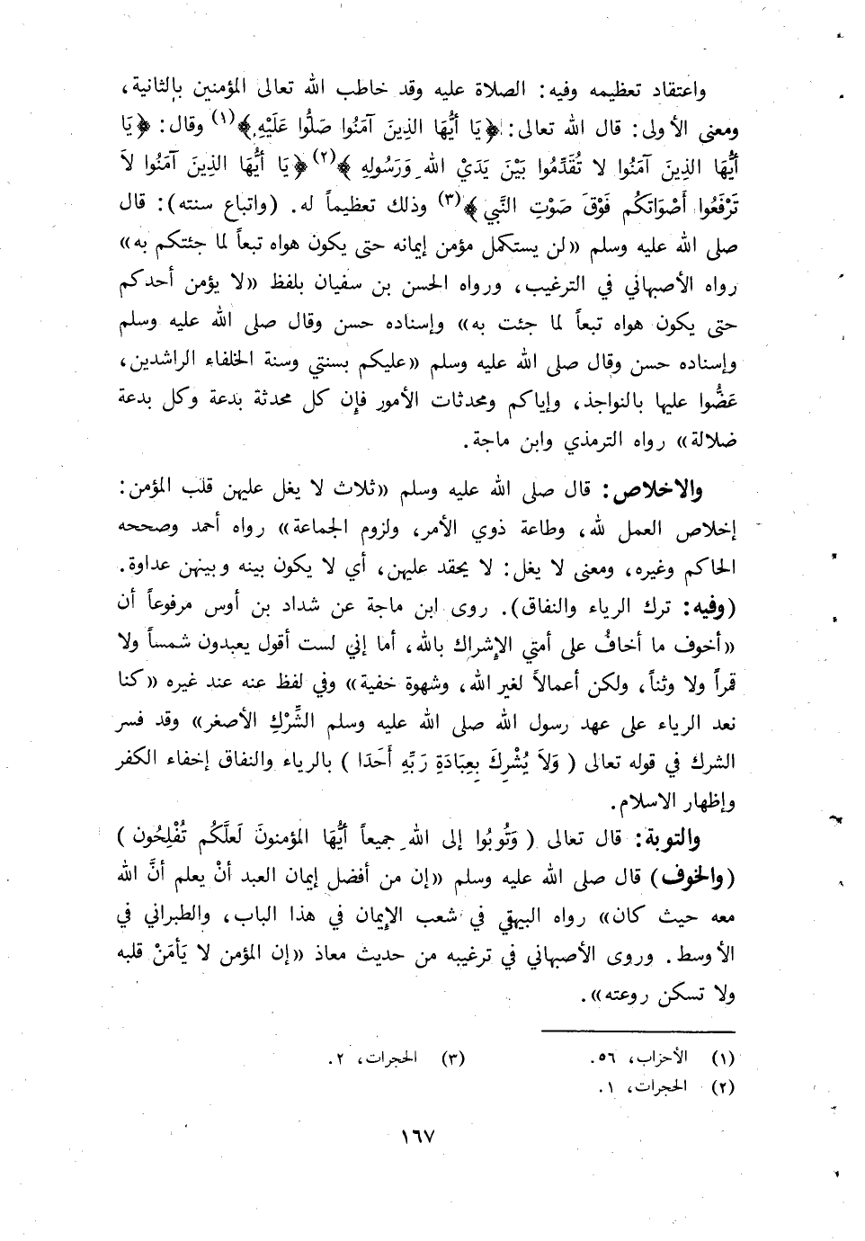 واعتقاد تَعْظِيمه وَفِيه الصَّلَاة عَلَيْهِ وَقد خَاطب الله تَعَالَى الْمُؤمنِينَ بِالثَّانِيَةِ وَمعنى الأولى قَالَ الله تَعَالَى {يَا أَيهَا الَّذين آمنُوا صلوا عَلَيْهِ} وَقَالَ {يَا أَيهَا الَّذين آمنُوا لَا تقدمُوا بَين يَدي الله وَرَسُوله} {يَا أَيهَا الَّذين آمنُوا لَا تَرفعُوا أَصْوَاتكُم فَوق صَوت النَّبِي} وَذَلِكَ تَعْظِيمًا لَهُ وَاتِّبَاع سنته قَالَ صلى الله عَلَيْهِ وَسلم