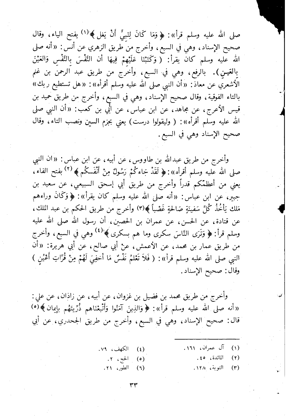 صلى الله عَلَيْهِ وَسلم قَرَأَ {وَمَا كَانَ لنَبِيّ أَن يغل} يفتح الْيَاء وَقَالَ صَحِيح الْإِسْنَاد وَهِي فِي السَّبع وَأخرج من طَرِيق الزُّهْرِيّ عَن أنس أَنه صلى الله عَلَيْهِ وَسلم كَانَ يقْرَأ {وكتبنا عَلَيْهِم فِيهَا أَن النَّفس بِالنَّفسِ وَالْعين بِالْعينِ} بِالرَّفْع وَهِي فِي السَّبع وَأخرج من طَرِيق عبد الرَّحْمَن بن غنم الْأَشْعَرِيّ عَن معَاذ أَن النَّبِي صلى الله عَلَيْهِ وَسلم أقرأه هَل تستيطع رَبك بِالتَّاءِ الْفَوْقِيَّة وَقَالَ صَحِيح الْإِسْنَاد وَهِي فِي السَّبع وَأخرج من طَرِيق حميد بن قيس الْأَعْرَج عَن مُجَاهِد عَن ابْن عَبَّاس عَن أبي بن كَعْب أَن النَّبِي صلى الله عَلَيْهِ وَسلم أقرأه وليقولوا درست يَعْنِي بجزم السِّين وَنصب التَّاء وَقَالَ صَحِيح الْإِسْنَاد وَهِي فِي السَّبع