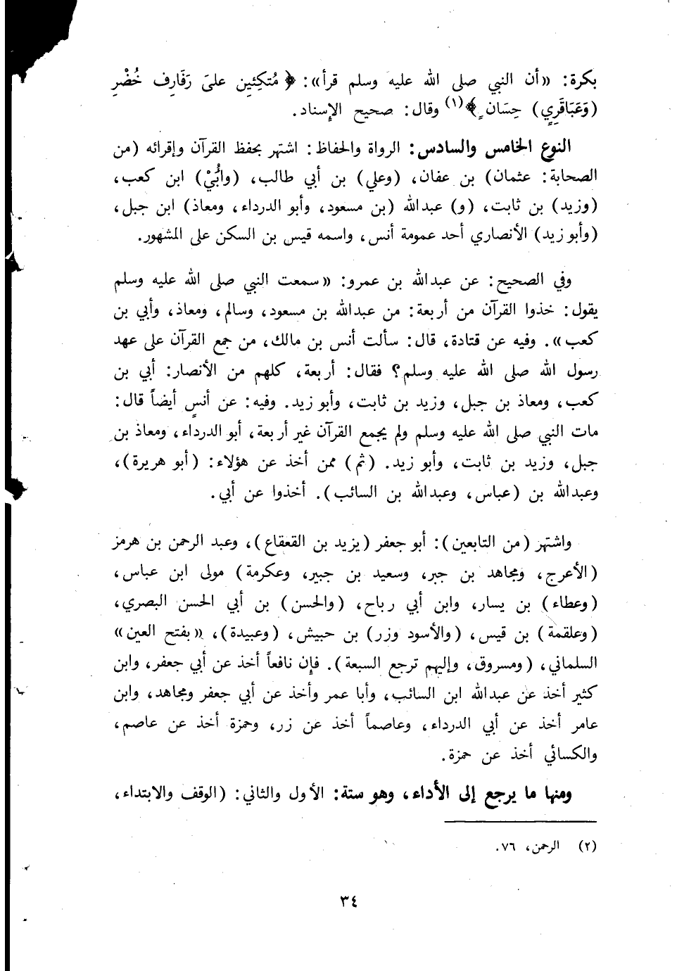 النَّوْع الْخَامِس وَالسَّادِس الروَاة والحفاظ اشْتهر بِحِفْظ الْقُرْآن وإقرائه من الصَّحَابَة عُثْمَان بن عَفَّان وَعلي بن أبي طَالب وابي ابْن كَعْب وَزيد بن ثَابت وَعبد الله بن مَسْعُود وَأَبُو الدَّرْدَاء ومعاد ابْن جبل وَأَبُو زيد الْأنْصَارِيّ أحد عمومة أنس واسْمه قيس بن السكن على الْمَشْهُور