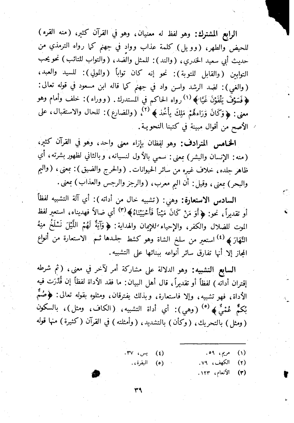 الرَّابِع الْمُشْتَرك وَهُوَ لفظ لَهُ مَعْنيانِ وَهُوَ فِي الْقُرْآن كثير مِنْهُ الْقُرْء للْحيض وَالطُّهْر وويل كلمة عَذَاب وواد فِي جَهَنَّم كَمَا رَوَاهُ الترميذي من حَدِيث أبي سعيد الْخُدْرِيّ والند للمثل والضد والتواب للتائب نَحْو يحب التوابين والقابل للتَّوْبَة نَحْو إِنَّه كَانَ تَوَّابًا والمولي للسَّيِّد وَالْعَبْد والغي لضد الرشد واسن وَاد فِي جَهَنَّم كَمَا قَالَه ابْن مَسْعُود فِي قَوْله تَعَالَى {فَسَوف يلقون غيا} رَوَاهُ الْحَاكِم فِي الْمُسْتَدْرك ووراء خلف وأمام وَهُوَ معنى {وَكَانَ وَرَاءَهُمْ ملك يَأْخُذ} والمضارع للْحَال والاستقبال على الْأَصَح من أَقْوَال مبينَة فِي كتبنَا النحوية