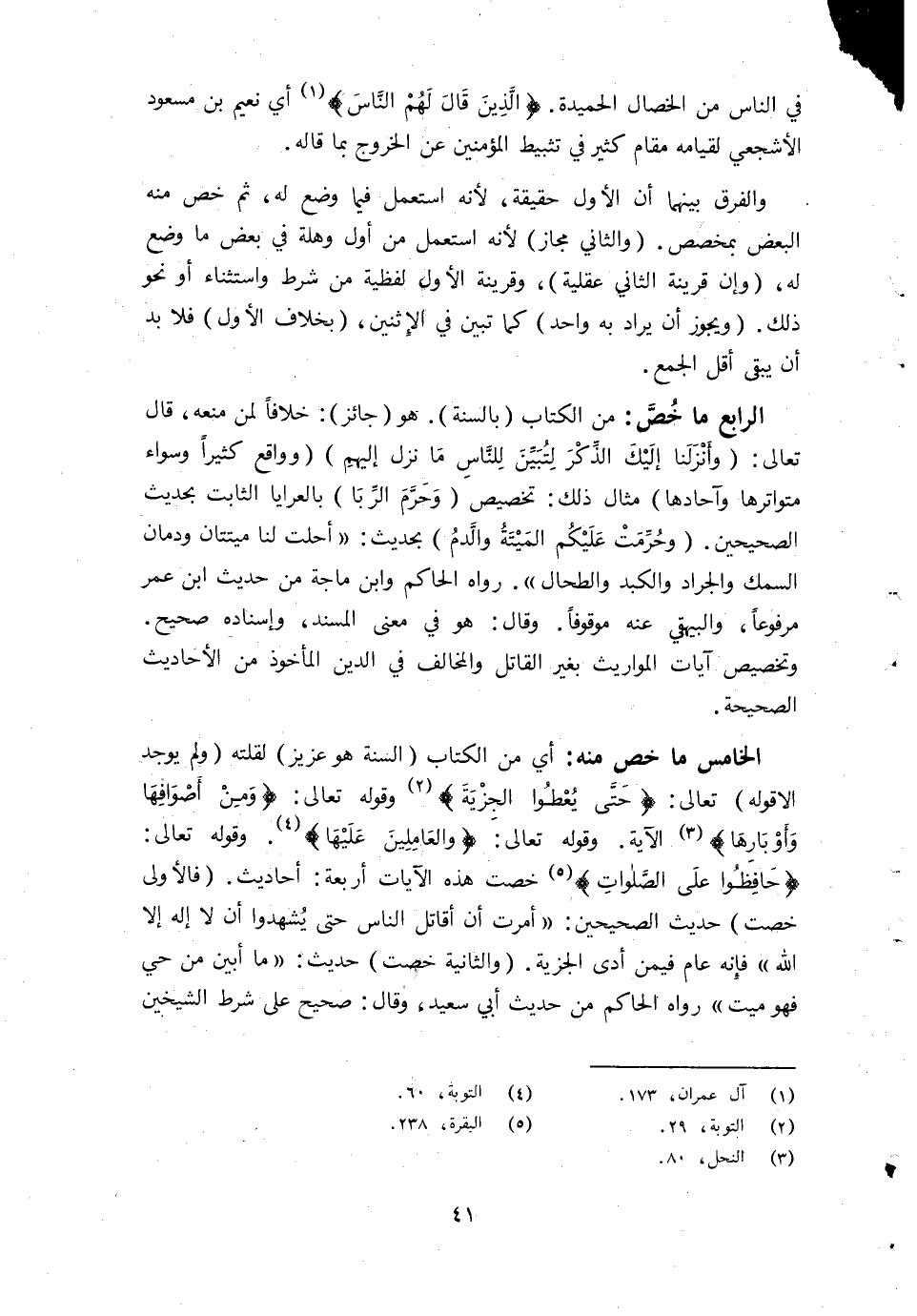 الْخَامِس مَا خص مِنْهُ أَي من الْكتاب السّنة هُوَ عَزِيز لقلته وَلم يُوجد الا قَوْله تَعَالَى {حَتَّى يُعْطوا الْجِزْيَة} وَقَوله تَعَالَى {وَمن أصوافها وأوبارها} الْآيَة وَقَوله تَعَالَى {والعاملين عَلَيْهَا} وَقَوله تَعَالَى {حَافظُوا على الصَّلَوَات} خصت هَذِه الْآيَات أَرْبَعَة أَحَادِيث فَالْأولى خصت حَدِيث الصَّحِيحَيْنِ أمرت أَن أقَاتل النَّاس حَتَّى يشْهدُوا أَن لَا إِلَه إِلَّا الله فَإِنَّهُ عَام فِيمَن أدّى الْجِزْيَة وَالثَّانيَِة خصت حَدِيث مَا أبين من حَيّ فَهُوَ ميت رَوَاهُ الْحَاكِم من حَدِيث أبي سعيد وَقَالَ صَحِيح على شَرط الشَّيْخَيْنِ