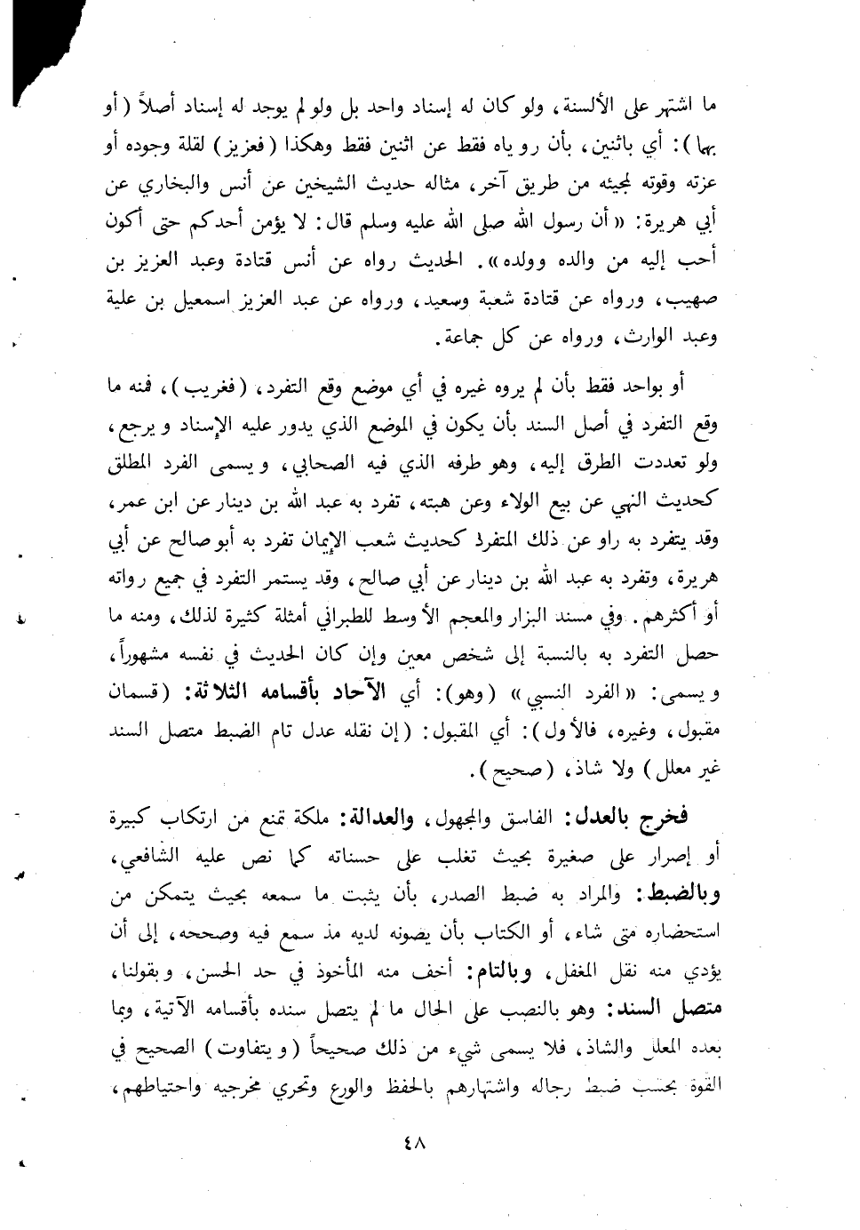 أَو بِوَاحِد فَقَط بِأَن لم يروه غَيره فِي أَي مَوضِع وَقع التفرد فَغَرِيب فَمِنْهُ مَا وَقع التفرد فِي أصل السَّنَد بِأَن يكون فِي الْموضع الَّذِي يَدُور عَلَيْهِ الْإِسْنَاد وَيرجع وَلَو تعدّدت الطّرق إِلَيْهِ وَهُوَ طرفه الَّذِي فِيهِ الصَّحَابِيّ وَيُسمى الْفَرد الْمُطلق كَحَدِيث النَّهْي عَن بيع الْوَلَاء وَعَن هِبته تفرد بِهِ عبد الله بن دِينَار عَن ابْن عمر وَقد يتفرد بِهِ راو عَن ذَلِك المتفرد كَحَدِيث شعب الْإِيمَان تفرد بِهِ أَبُو صَالح عَن أبي هُرَيْرَة وَتفرد بِهِ عبد الله بن دِينَار عَن أبي صَالح وَقد يسْتَمر التفرد فِي جَمِيع رُوَاته أَو أَكْثَرهم وَفِي مُسْند الْبَزَّار والمعجم الْأَوْسَط للطبراني أَمْثِلَة كَثِيرَة لذَلِك وَمِنْه مَا حصل التفرد بِهِ بِالنِّسْبَةِ إِلَى شخص معِين وَإِن كَانَ الحَدِيث فِي نَفسه مَشْهُورا وَيُسمى الْفَرد النسبي وَهُوَ أَي الْآحَاد بأقسامه الثَّلَاثَة قِسْمَانِ مَقْبُول وَغَيره فَالْأول أَي المقبول إِن نَقله عدل تَامّ الضَّبْط مُتَّصِل السَّنَد غير مُعَلل وَلَا شَاذ صَحِيح