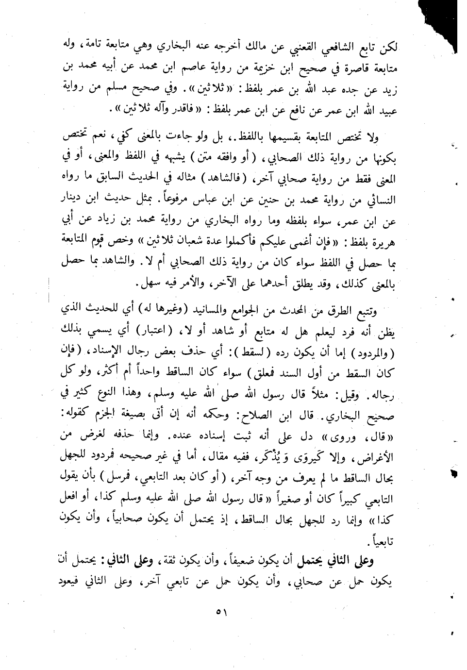 وَلَا تخْتَص الْمُتَابَعَة بقسيمها بِاللَّفْظِ بل وَلَو جَاءَت بِالْمَعْنَى كفي نعم تخْتَص بِكَوْنِهَا من رِوَايَة ذَلِك الصَّحَابِيّ أَو وَافقه متن يُشبههُ فِي اللَّفْظ وَالْمعْنَى أَو فِي الْمَعْنى فَقَط من رِوَايَة صَحَابِيّ آخر فالشاهد مِثَاله فِي الحَدِيث السَّابِق مَا رَوَاهُ النَّسَائِيّ من رِوَايَة مُحَمَّد بن حنين عَن ابْن عَبَّاس مَرْفُوعا بِمثل حَدِيث ابْن دِينَار عَن ابْن عمر سَوَاء بِلَفْظِهِ وَمَا رَوَاهُ البُخَارِيّ من رِوَايَة مُحَمَّد بن زِيَاد عَن أبي هُرَيْرَة بِلَفْظ