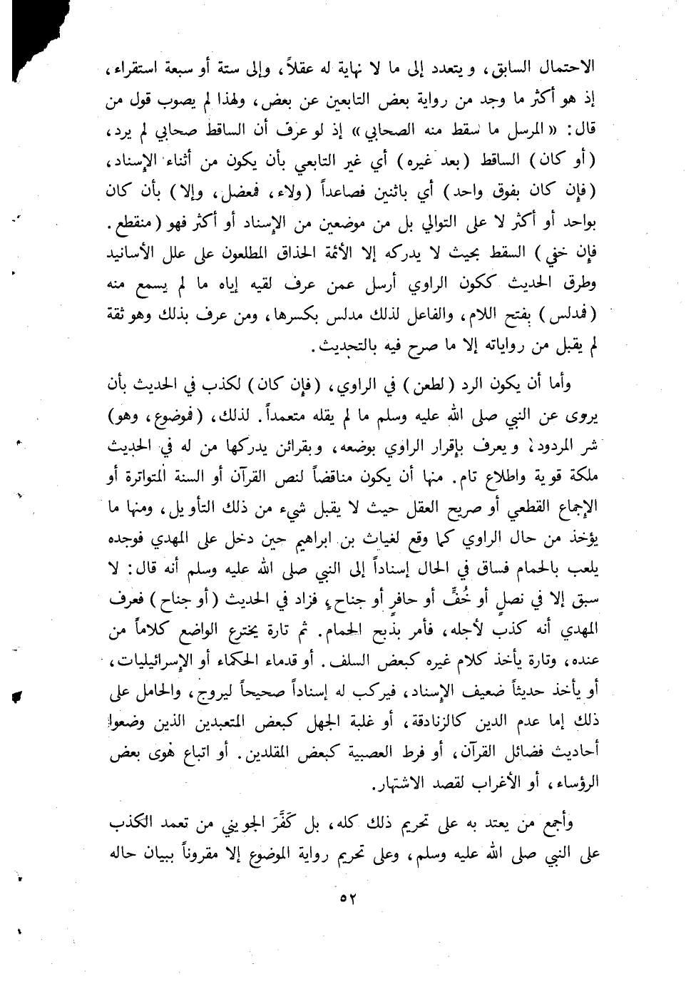 الِاحْتِمَال السَّابِق ويتعدد إِلَى مَا لَا نِهَايَة لَهُ عقلا وَإِلَى سِتَّة أَو سَبْعَة استقراء إِذْ هُوَ أَكثر مَا وجد من رِوَايَة بعض التَّابِعين عَن بعض وَلِهَذَا لم يصوب قَول من قَالَ الْمُرْسل مَا سقط مِنْهُ الصَّحَابِيّ إِذْ لَو عرف أَن السَّاقِط صَحَابِيّ لم يرد أَو كَانَ السَّاقِط بعد غَيره أَي غير التَّابِعِيّ بِأَن يكون من أثْنَاء الْإِسْنَاد فَإِن كَانَ يفوق وَاحِد أَي بِاثْنَيْنِ فَصَاعِدا وَلَاء فمعضل وَإِلَّا بِأَن كَانَ بِوَاحِد أَو أَكثر لَا التوالي بل من موضِعين من الْإِسْنَاد أَو أَكثر فَهُوَ مُنْقَطع فَإِن خَفِي السقط بِحَيْثُ لَا يُدْرِكهُ إِلَّا الْأَئِمَّة الحذاق المطلعون على علل الْأَسَانِيد وطرق الحَدِيث ككون الرَّاوِي أرسل عَمَّن عرف لقِيه إِيَّاه مَا لم يسمع مِنْهُ فمدلس بِفَتْح اللَّام وَالْفَاعِل لذَلِك مُدَلّس بِكَسْرِهَا وَمن عرف بذلك وَهُوَ ثِقَة لم يقبل من رواياته إِلَّا مَا صرح فِيهِ بِالتَّحْدِيثِ