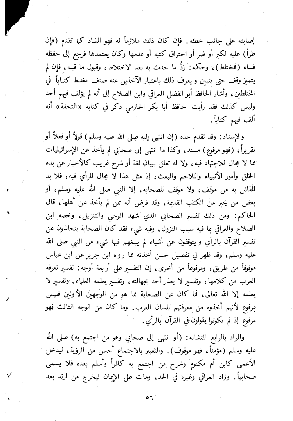 والإسناد وَقد تقدم حَده إِن انْتهى إِلَيْهِ صلى الله عَلَيْهِ وَسلم قولا أَو فعلا أَو تقريرا فَهُوَ مَرْفُوع مُسْند وَكَذَا مَا انْتهى إِلَى صَحَابِيّ لم يَأْخُذ عَن الْإسْرَائِيلِيات مِمَّا لَا مجَال للإجتهاد فِيهِ وَلَا لَهُ تعلق بِبَيَان لُغَة أَو شرح غَرِيب كالأخبار عَن بَدْء الْخلق وَأُمُور الْأَنْبِيَاء والملاحم والبعث إِذْ مثل هَذَا لَا مجَال للرأي فِيهِ فَلَا بُد للقائل بِهِ من موقف وَلَا موقف للصحابة إِلَّا النَّبِي صلى الله عَلَيْهِ وَسلم أَو بعض من يخبر عَن الْكتب الْقَدِيمَة وَقد فرض أَنه مِمَّن لم يَأْخُذ عَن أَهلهَا قَالَ الْحَاكِم وَمن ذَلِك تَفْسِير الصَّحَابِيّ الَّذِي شهد الْوَحْي والتنزيل وَخَصه ابْن الصّلاح والعراقي بِمَا فِيهِ سَبَب النُّزُول وَفِيه شَيْء فقد كَانَ الصَّحَابَة يتحاشون عَن تَفْسِير الْقُرْآن بِالرَّأْيِ ويتوقفون عَن أَشْيَاء لم يبلغهم فِيهَا شَيْء من النَّبِي صلى الله عَلَيْهِ وَسلم وَقد ظهر لي تَفْصِيل حسن أَخَذته مِمَّا رَوَاهُ ابْن جرير عَن ابْن عَبَّاس مَوْقُوفا من طَرِيق وَمَرْفُوعًا من أُخْرَى إِن التَّفْسِير على أَرْبَعَة أوجه تَفْسِير تعرفه الْعَرَب من كَلَامهَا وَتَفْسِير لَا يعْذر أحد بجهالته وَتَفْسِير يُعلمهُ الْعلمَاء وَتَفْسِير لَا يُعلمهُ إِلَّا الله تَعَالَى فَمَا كَانَ عَن الصَّحَابَة مِمَّا هُوَ من الْوَجْهَيْنِ الْأَوَّلين فَلَيْسَ بمرفوع لأَنهم أَخَذُوهُ من معرفتهم بِلِسَان الْعَرَب وَمَا كَانَ من الْوَجْه الثَّالِث فَهُوَ مَرْفُوع إِذْ لم يَكُونُوا يَقُولُونَ فِي الْقُرْآن بِالرَّأْيِ