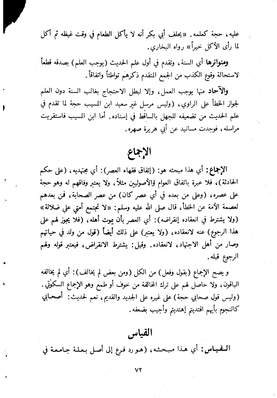 لَا تَجْتَمِع أمتِي على ضَلَالَة وَلَا يشْتَرط فِي انْعِقَاده إنقراضه أَي الْعَصْر بِأَن يَمُوت أَهله فَلَا يجوز لَهُم على هَذَا الرُّجُوع عَنهُ لانعقاده وَلَا يعْتَبر على ذَلِك أَيْضا قَول من ولد فِي حياتهم وَصَارَ من أهل الِاجْتِهَاد لانعقاده وَقيل يشْتَرط الانقراض فَيعْتَبر قَوْله وَلَهُم الرُّجُوع قبله وَيصِح الْإِجْمَاع بقول وَفعل من الْكل وَمن بعض لم يُخَالف أَي لم يُخَالِفهُ الْبَاقُونَ وَلَا حَاصِل لَهُم على ترك الْمُخَالفَة من خوف أَو طمع وَهُوَ الْإِجْمَاع السكوتي وَلَيْسَ قَول صَحَابِيّ حجَّة على غَيره على الْجَدِيد وَالْقَدِيم نعم لحَدِيث أَصْحَابِي كَالنُّجُومِ بِأَيِّهِمْ اقْتَدَيْتُمْ إهتديتم وَأجِيب بضعفه