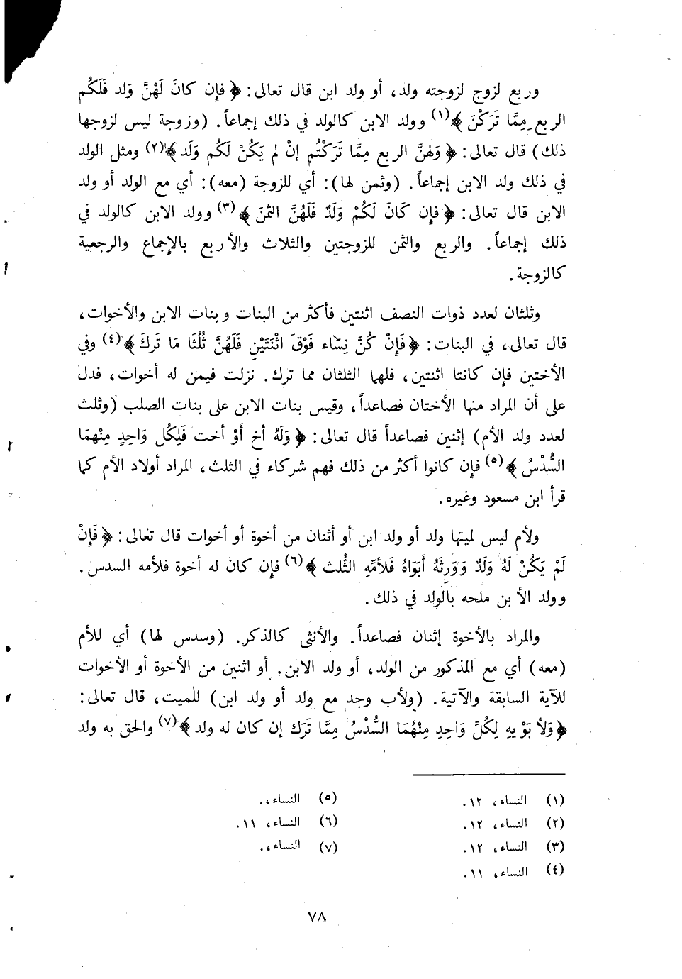 وَثُلُثَانِ لعدد ذَوَات النّصْف اثْنَتَيْنِ فَأكْثر من الْبَنَات وَبَنَات الابْن وَالْأَخَوَات قَالَ تَعَالَى فِي الْبَنَات {فَإِن كن نسَاء فَوق اثْنَتَيْنِ فَلَهُنَّ ثلثا مَا ترك} وَفِي الْأُخْتَيْنِ فَإِن كَانَتَا اثْنَتَيْنِ فَلَهُمَا الثُّلُثَانِ مِمَّا ترك نزلت فِيمَن لَهُ أَخَوَات فَدلَّ على أَن المُرَاد مِنْهَا الْأخْتَان فَصَاعِدا وَقيس بَنَات الابْن على بَنَات الصلب وَثلث لعدد ولد الْأُم إثنين فَصَاعِدا قَالَ تَعَالَى {وَله أَخ أَو أُخْت فَلِكُل وَاحِد مِنْهُمَا السُّدس} فَإِن كَانُوا أَكثر من ذَلِك فهم شُرَكَاء فِي الثُّلُث المُرَاد أَوْلَاد الْأُم كَمَا قَرَأَ ابْن مَسْعُود وَغَيره