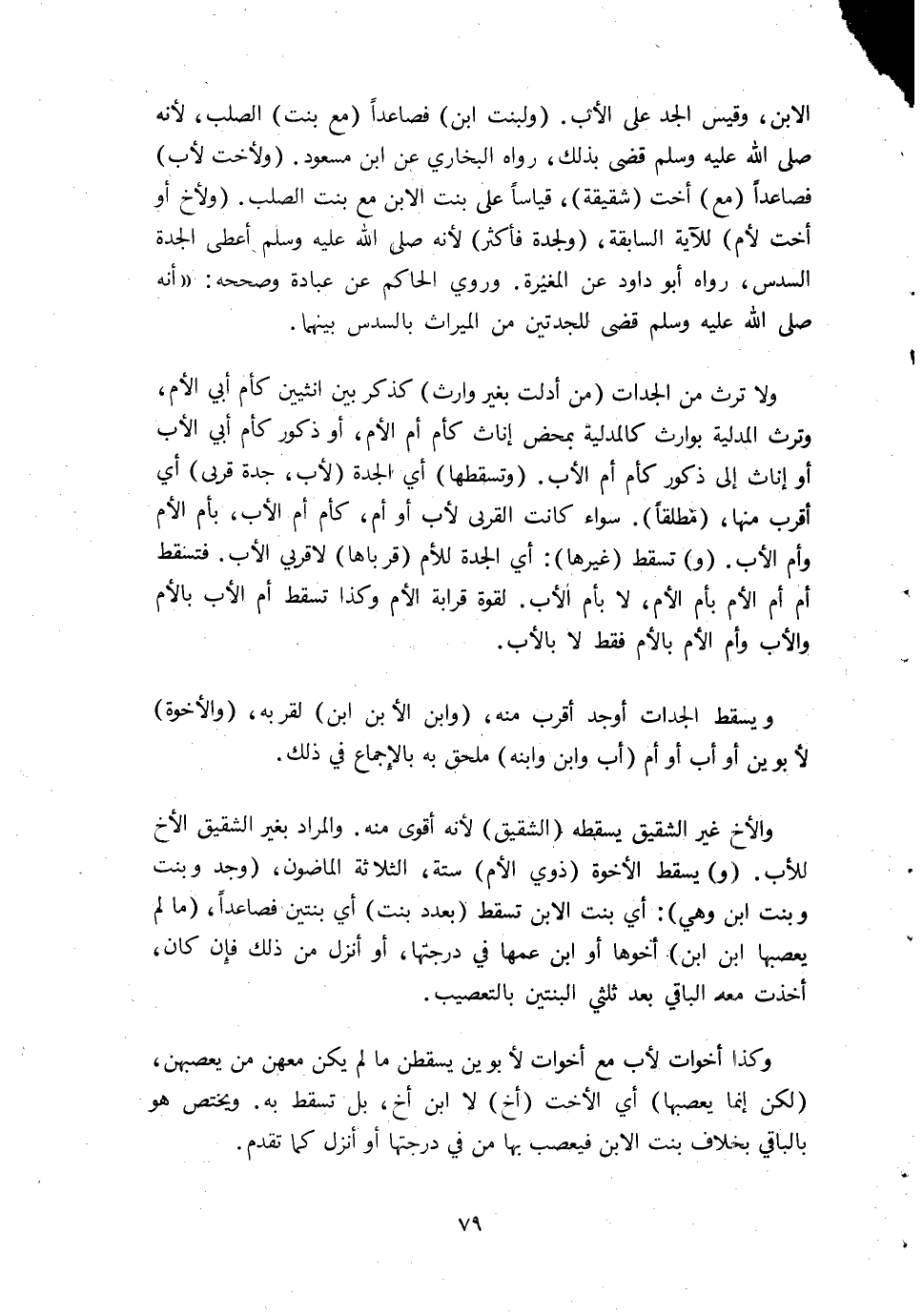وَالْأَخ غير الشَّقِيق يسْقطهُ الشَّقِيق لِأَنَّهُ أقوى مِنْهُ وَالْمرَاد بِغَيْر الشَّقِيق الْأَخ للْأَب وَيسْقط الْأُخوة ذَوي الْأُم سِتَّة الثَّلَاثَة الماضون وجد وَبنت وَبنت ابْن وَهِي أَي بنت الابْن تسْقط بِعَدَد بنت أَي بنتين فَصَاعِدا مَا لم يعصبها ابْن ابْن أَخُوهَا أَو ابْن عَمها فِي درجتها أَو أنزل من ذَلِك فَإِن كَانَ أخذت مَعَه الْبَاقِي بعد ثُلثي البنتين بِالتَّعْصِيبِ