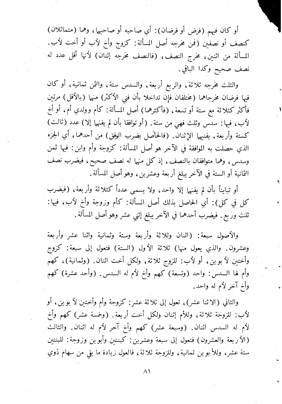 وَالْأُصُول سَبْعَة اثْنَان وَثَلَاثَة وَأَرْبَعَة وَسِتَّة وَثَمَانِية وَاثنا عشر وَأَرْبَعَة وَعِشْرُونَ وَالَّذِي يعول مِنْهَا ثَلَاثَة الأول السِّتَّة فتعول إِلَى سَبْعَة كَزَوج وأختين لِأَبَوَيْنِ أَو لأَب للزَّوْج ثَلَاثَة وَلكُل أُخْت اثْنَان وَثَمَانِية كهم وَأم لَهَا السُّدس وَاحِد وَتِسْعَة كهم وَأَخ لأم لَهُ السُّدس وَأحد عشرَة كهم وَأَخ آخر لأم لَهُ وَاحِد