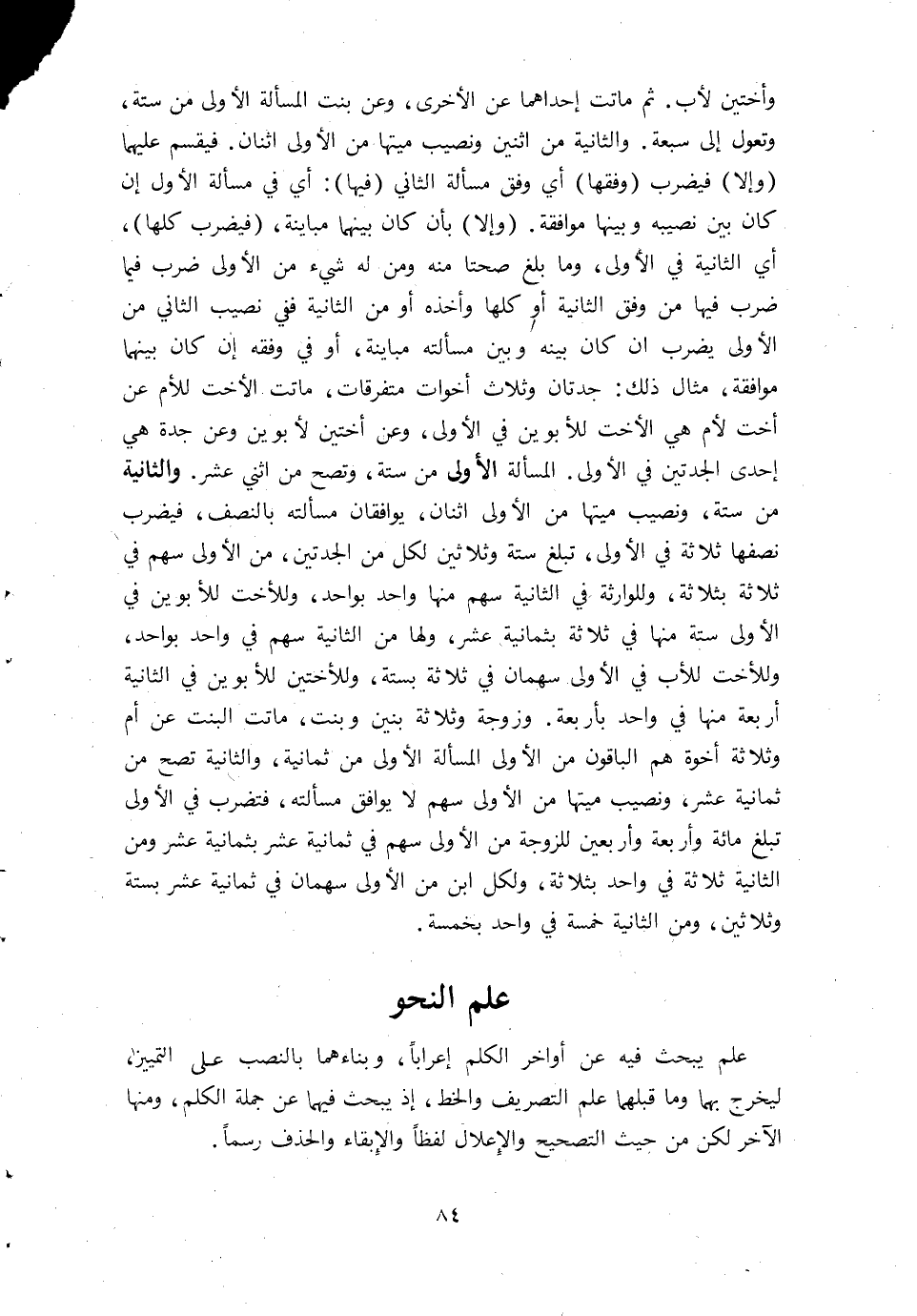 وأختين لأَب ثمَّ مَاتَت إِحْدَاهمَا عَن الْأُخْرَى وَعَن بنت الْمَسْأَلَة الأولى من سِتَّة وتعول إِلَى سَبْعَة وَالثَّانيَِة من اثْنَيْنِ وَنصِيب ميتها من الأولى اثْنَان فَيقسم عَلَيْهِمَا وَإِلَّا فَيضْرب وفقها أَي وفْق مَسْأَلَة الثَّانِي فِيهَا أَي فِي مَسْأَلَة الأول إِن كَانَ بَين نصِيبه وَبَينهَا مُوَافقَة وَإِلَّا بِأَن كَانَ بَينهمَا مباينة فَيضْرب كلهَا أَي الثَّانِيَة فِي الأولى وَمَا بلغ صحتا مِنْهُ وَمن لَهُ شَيْء من الأولى ضرب فِيمَا ضرب فِيهَا من وفْق الثَّانِيَة أَو كلهَا وَأَخذه أَو من الثَّانِيَة فَفِي نصيب الثَّانِي من الأولى يضْرب أَن كَانَ بَينه وَبَين مَسْأَلته مباينة أَو فِي وَفقه إِن كَانَ بَينهمَا مُوَافقَة مِثَال ذَلِك جدتان وَثَلَاث أَخَوَات متفرقات مَاتَت الْأُخْت للْأُم عَن أُخْت لأم هِيَ الْأُخْت لِلْأَبَوَيْنِ فِي الأولى وَعَن أُخْتَيْنِ لِأَبَوَيْنِ وَعَن جدة هِيَ إِحْدَى الجدتين فِي الأولى الْمَسْأَلَة الأولى من سِتَّة وَتَصِح من اثْنَي عشر وَالثَّانيَِة من سِتَّة وَنصِيب ميتها من الأولى اثْنَان يوافقان مَسْأَلته بِالنِّصْفِ فَيضْرب نصفهَا ثَلَاثَة فِي الأولى تبلغ سِتَّة وَثَلَاثِينَ لكل من الجدتين من الأولى سهم فِي ثَلَاثَة بِثَلَاثَة وللوارثة فِي الثَّانِيَة سهم مِنْهَا وَاحِد بِوَاحِد وَللْأُخْت لِلْأَبَوَيْنِ فِي الأولى سِتَّة مِنْهَا فِي ثَلَاثَة بِثمَانِيَة عشر وَلها من الثَّانِيَة سهم فِي وَاحِد بِوَاحِد وَللْأُخْت للْأَب فِي الأولى سَهْمَان فِي ثَلَاثَة بِسِتَّة وللأختين لِلْأَبَوَيْنِ فِي الثَّانِيَة أَرْبَعَة مِنْهَا فِي وَاحِد بأَرْبعَة وَزَوْجَة وَثَلَاثَة بَنِينَ وَبنت مَاتَت الْبِنْت عَن أم وَثَلَاثَة أخوة هم الْبَاقُونَ من الأولى الْمَسْأَلَة الأولى من ثَمَانِيَة وَالثَّانيَِة تصح من ثَمَانِيَة عشر وَنصِيب ميتها من الأولى سهم لَا يُوَافق مَسْأَلته فَتضْرب فِي الأولى تبلغ مائَة وَأَرْبَعَة وَأَرْبَعين للزَّوْجَة من الأولى سهم فِي ثَمَانِيَة عشر بِثمَانِيَة عشر وَمن الثَّانِيَة ثَلَاثَة فِي وَاحِد بِثَلَاثَة وَلكُل ابْن من الأولى سَهْمَان فِي ثَمَانِيَة عشر بِسِتَّة وَثَلَاثِينَ وَمن الثَّانِيَة خَمْسَة فِي وَاحِد بِخَمْسَة