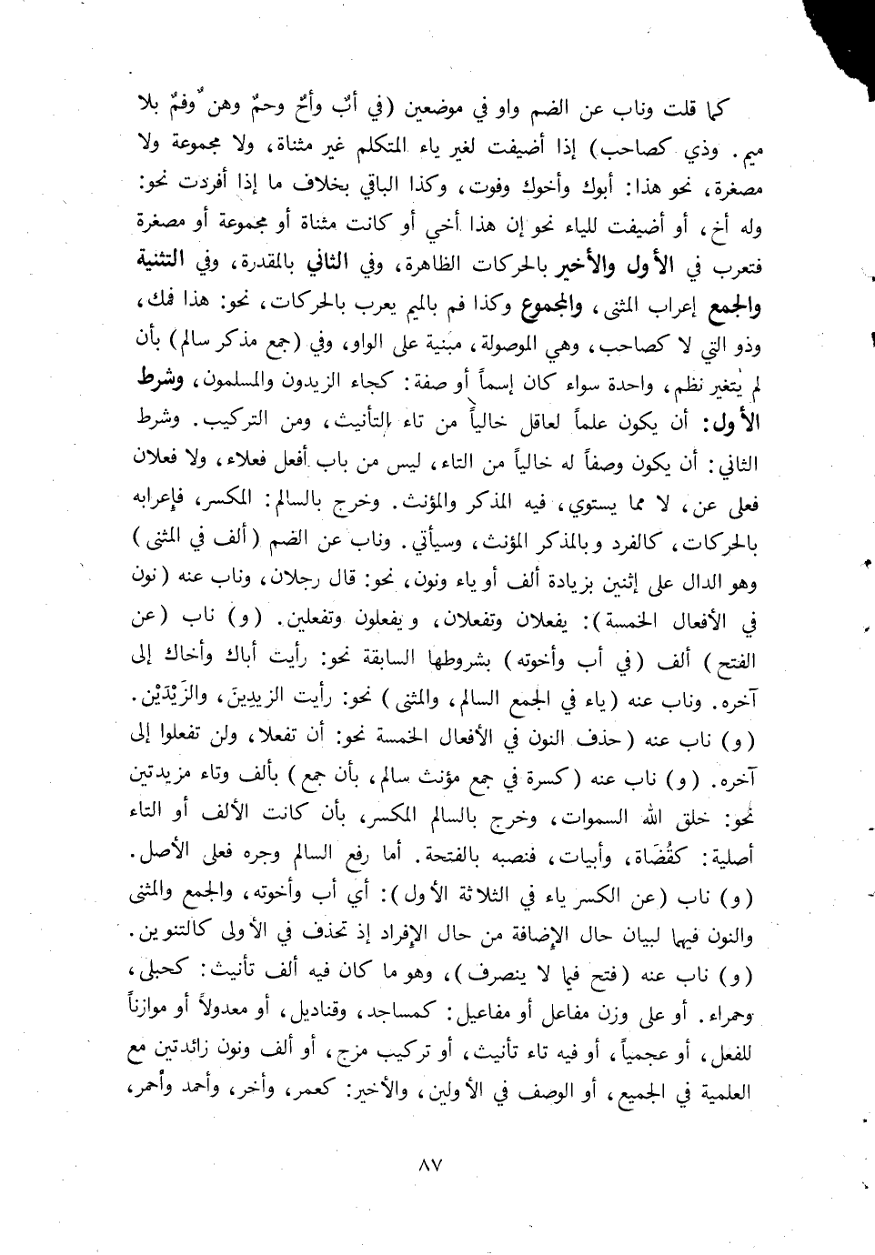 كَمَا قلت وناب عَن الضَّم وَاو فِي موضِعين فِي أَب وَأَخ وحم وَهن وفم بِلَا مِيم وَذي كصاحب إِذا أضيفت لغير يَاء الْمُتَكَلّم غير مثناة وَلَا مَجْمُوعَة وَلَا مصغرة نَحْو هَذَا أَبوك وأخوك وفوت وَكَذَا الْبَاقِي بِخِلَاف مَا إِذا أفردت نَحْو وَله أَخ أَو أضيفت للياء نَحْو إِن هَذَا أخي أَو كَانَت مثناة أَو مَجْمُوعَة أَو مصغرة فتعرب فِي الأول والأخير بالحركات الظَّاهِرَة وَفِي الثَّانِي بالمقدرة وَفِي التَّثْنِيَة وَالْجمع إِعْرَاب الْمثنى وَالْمَجْمُوع وَكَذَا فَم بِالْمِيم يعرب بالحركات نَحْو هَذَا فك وَذُو الَّتِي لَا كصاحب وَهِي الموصولة مَبْنِيَّة على الْوَاو وَفِي جمع مُذَكّر سَالم بِأَن لم يتَغَيَّر نظم وَاحِدَة سَوَاء كَانَ إسما أَو صفة كجاء الزيدون والمسلمون وَشرط الأول أَن يكون علما لعاقل خَالِيا من تَاء التَّأْنِيث وَمن التَّرْكِيب وَشرط الثَّانِي أَن يكون وَصفا لَهُ خَالِيا من التَّاء لَيْسَ من بَاب أفعل فعلاء وَلَا فعلان فعلى عَن لَا مِمَّا يتسوى فِيهِ الْمُذكر والمؤنث وَخرج بالسالم المكسر فإعرابه بالحركات كالفرد وبالمذكر الْمُؤَنَّث وَسَيَأْتِي وناب عَن الضَّم ألف فِي الْمثنى وَهُوَ الدَّال على إثنين بِزِيَادَة ألف أَو يَاء وَنون نَحْو قَالَ رجلَانِ وناب عَنهُ نون فِي الْأَفْعَال الْخَمْسَة يفْعَلَانِ وتفعلان ويفعلون وتفعلين وناب عَن الْفَتْح ألف فِي أَب وأخوته بشروطها السَّابِقَة نَحْو رَأَيْت أَبَاك وأخاك إِلَى آخِره وناب عَنهُ يَاء فِي الْجمع السَّالِم والمثنى نَحْو رَأَيْت الزيدين والزيدين وناب عَنهُ حذف النُّون فِي الْأَفْعَال الْخَمْسَة نَحْو أَن تفعلا وَلنْ تَفعلُوا إِلَى آخِره وناب عَنهُ كسرة فِي جمع مؤنث سَالم بِأَن جمع بِأَلف وتاء مزيدتين نَحْو خلق الله السَّمَوَات وَخرج بالسالم المكسر بِأَن كَانَت الْألف أَو التَّاء أَصْلِيَّة كقضاة وأبيات فنصبه بالفتحة أما رفع السَّالِم وجره فعلى الأَصْل وناب عَن الْكسر يَاء فِي الثَّلَاثَة الأول أَي أَب وأخوته وَالْجمع والمثنى وَالنُّون فيهمَا لبَيَان حَال الْإِضَافَة من حَال الْإِفْرَاد إِذْ تحذف فِي الأولى كالتنوين وناب عَنهُ فتح فِيمَا لَا ينْصَرف وَهُوَ مَا كَانَ فِيهِ ألف تَأْنِيث كحبلى وحمراء أَو على وزن مفاعل أَو مفاعيل كمساجد وقناديل أَو معدولا أَو موازنا للْفِعْل أَو عجميا أَو فِيهِ تَاء تَأْنِيث أَو تركيب مزج أَو ألف وَنون زائدتين مَعَ العلمية فِي الْجَمِيع أَو الْوَصْف فِي الْأَوَّلين والأخير كعمر وَأخر وَأحمد وأحمر