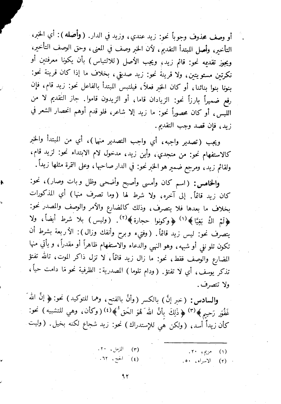 وَالْخَامِس اسْم كَانَ وَأمسى وَأصْبح وأضحى وظل وَبَات وَصَارَ نَحْو كَانَ زيد قَائِما إِلَى آخِره وَلَا شَرط لَهَا وَمَا تصرف مِنْهَا أَي الْمَذْكُورَات بِخِلَاف مَا بعْدهَا فَلَا يتَصَرَّف وَذَلِكَ كالمضارع وَالْأَمر وَالْوَصْف والمصدر نَحْو {وَلم أك بغيا} {كونُوا حِجَارَة} وَلَيْسَ بِلَا شَرط أَيْضا وَلَا يتَصَرَّف نَحْو لَيْسَ زيد قَائِما وفتيء وبرح وأنفك وَزَالَ الْأَرْبَعَة بِشَرْط أَن تكون تلو نفي أَو شبهه وَهُوَ النَّهْي وَالدُّعَاء والاستفهام ظَاهرا أَو مُقَدرا وَيَأْتِي مِنْهَا الْمُضَارع وَالْوَصْف فَقَط نَحْو مَا زَالَ زيد قَائِما لَا تزل ذَاكر الْمَوْت تالله تفتؤ تذكر يُوسُف أَي لَا تفتؤ ودام تلوما المصدرية الظَّرْفِيَّة نَحْو مَا دَامَت حَيا وَلَا تتصرف