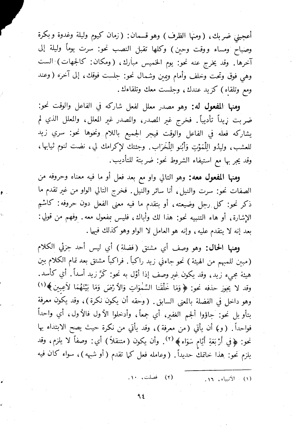 أعجبني ضربك وَمِنْهَا الظّرْف وَهُوَ قِسْمَانِ زمَان كَيَوْم وَلَيْلَة وغدوة وبكرة وصباح وَمَسَاء وَوقت وَحين وَكلهَا تقبل النصب نَحْو سرت يَوْمًا وَلَيْلَة إِلَى آخرهَا وَقد يخرج عَنهُ نَحْو يَوْم الْخَمِيس مبارك وَمَكَان كالجهات السِّت وَهِي فَوق وَتَحْت وَخلف وأمام وَيَمِين وشمال نَحْو جَلَست فَوْقك إِلَى آخِره وَعند وَمَعَ وتلقاه كزيد عنْدك وَجَلَست مَعَك وتلقاءك