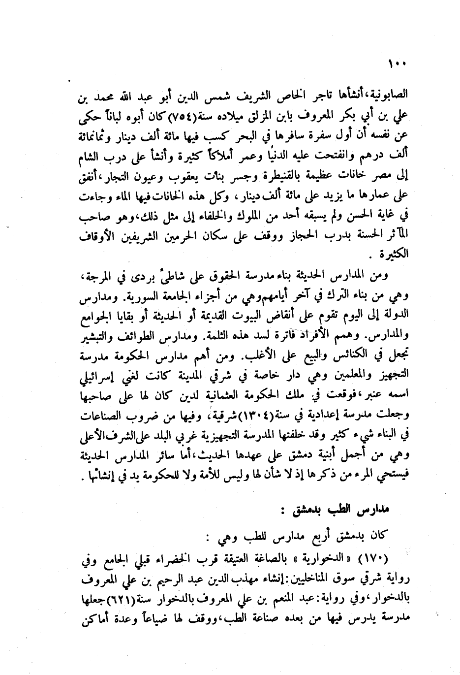 170 - الدخوارية بالصاعة العتيقة قرب الخضراء قبلي الجامع وفي رواية شرقي سوق المناخليين: إنشاء مهذب الدين عبد الرحيم بن علي المعروف بالدخوار، وفي رواية: عبد المنعم بن علي المعروف بالدخوار سنة 621 جعلها مدرسة يدرس فيها من بعده صناعة الطب، ووقف لها ضياعاً وعدة أماكن