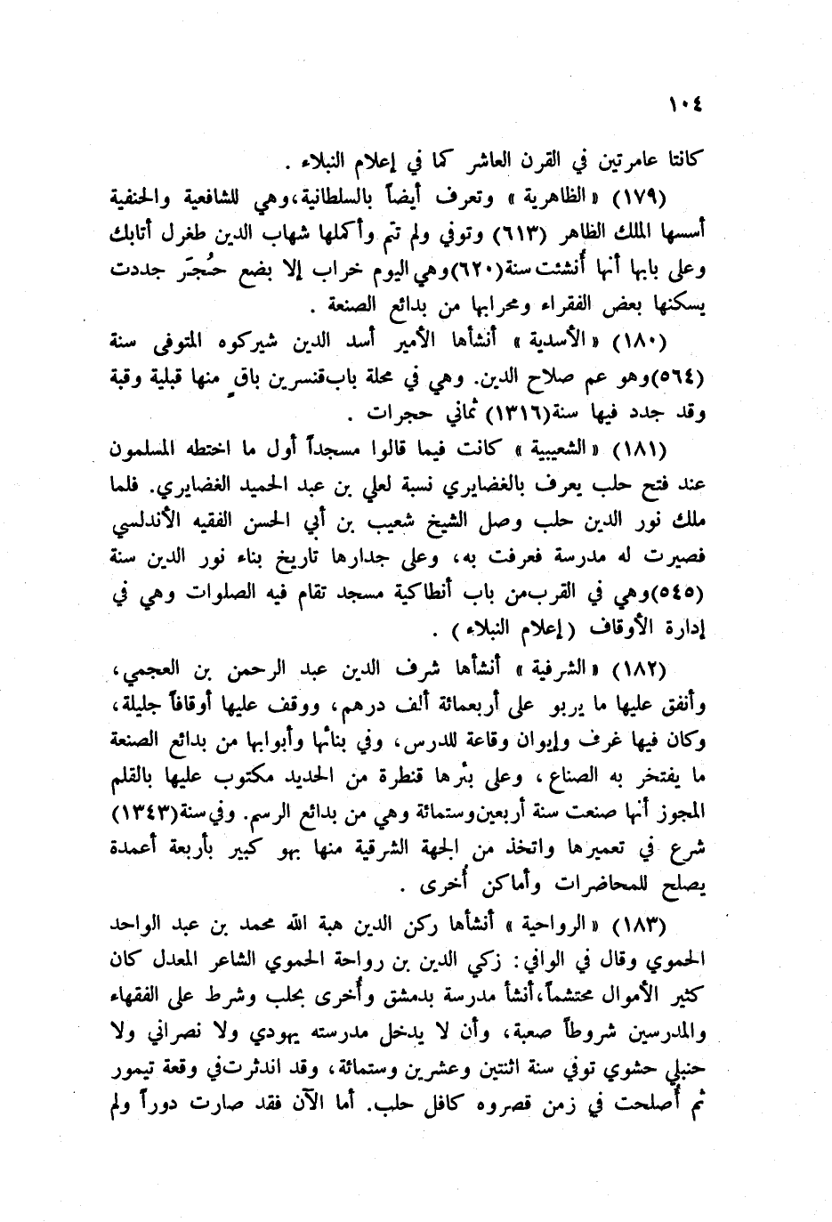 183 - الرواحية أنشأها ركن الدين هبة الله محمد بن عبد الواحد الحموي وقال في الوافي: زكي الدين بن رواحة الأموي الشاعر المعدل كان كثير الأموال محتشماً، أنشأ مدرسة بدمشق وأخرى بحلب وشرط على الفقهاء والمدرسين شروطاً صعبة، وأن لا يدخل مدرسته يهودي ولا نصراني ولا حنبلي حشوي توفي سنة اثنتين وعشرين وستمائة، وقد اندثرت في وقعة تيمور ثم أصلحت في زمن قصروه كافل حلب. أما الآن فقد صارت دوراً ولم
