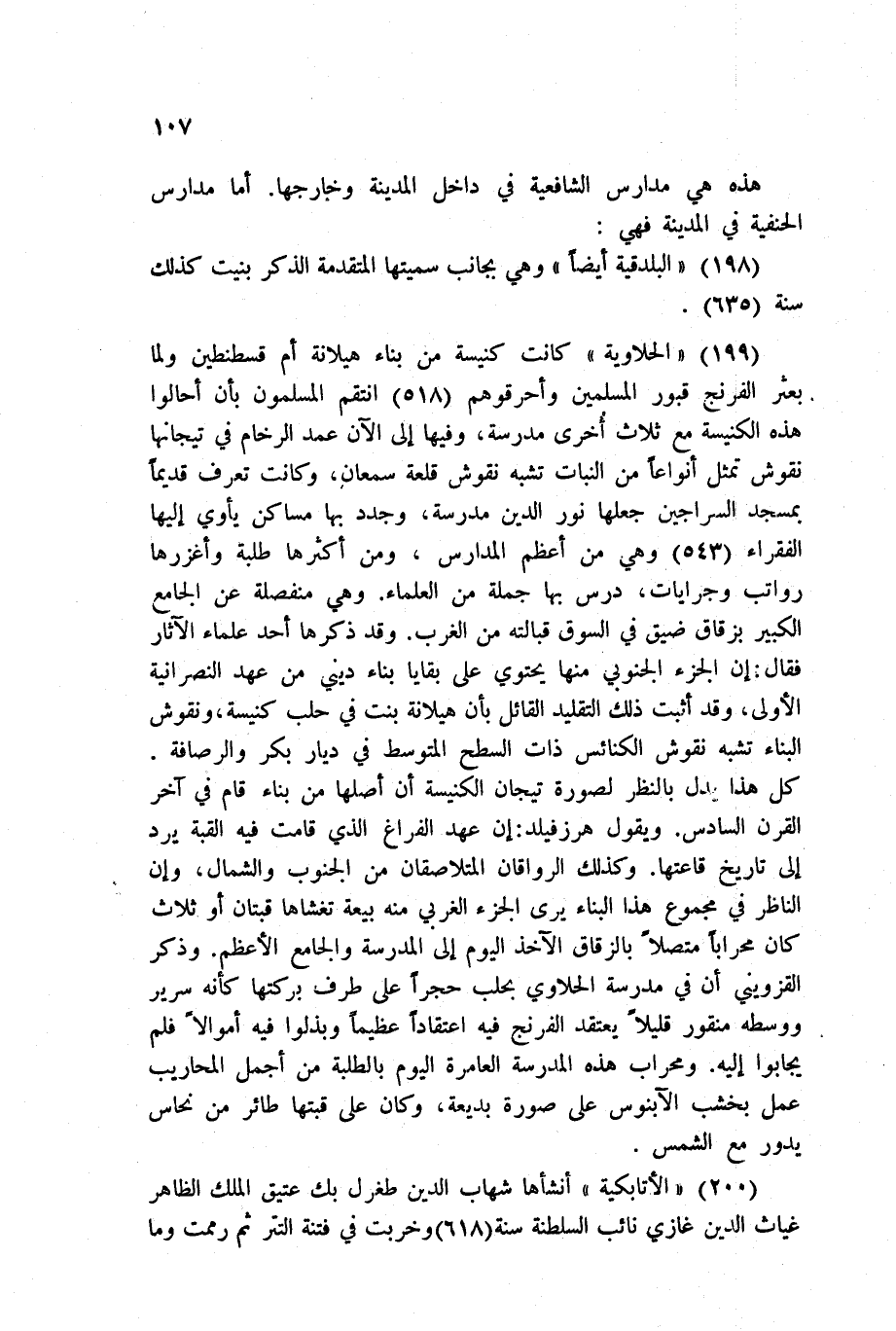 199 - الحلاوية كانت كنيسة من بناء هيلانة أم قسطنطين ولما بعثر الفرنج قبور المسلمين وأحرقوهم 518 انتقم المسلمون بأن أحالوا هذه الكنيسة مع ثلاث أخرى مدرسة، وفيها إلى الآن عمد الرخام في تيجانها نقوش تمثل أنواعاً من النبات تشبه نقوش قلعة سمعان، وكانت تعرف قديماً بمسجد السراجين جعلها نور الدين مدرسة، وجدد بها مساكن يأوي إليها الفقراء 543 وهي من أعظم المدارس، ومن أكثرها طلبة وأغزرها رواتب وجرايات، درس بها جملة من العلماء. وهي منفصلة عن الجامع الكبير بزقاق ضيق في السوق قبالته من الغرب. وقد ذكرها أحد علماء الآثار فقال: إن الجزء الجنوبي منها يحتوي على بقايا بناء ديني من