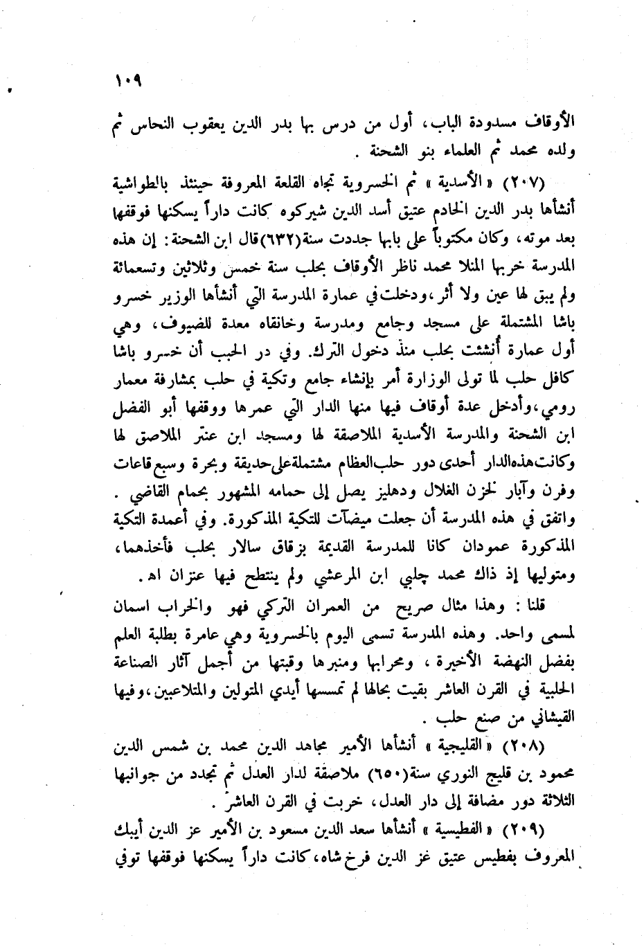 قلنا: وهذا مثال صريح من العمران التركي فهو والخراب اسمان لمسمى واحد. وهذه المدرسة تسمى اليوم بالخسروية وهي عامرة بطلبة العلم بفضل النهضة الأخيرة، ومحرابها ومنبرها وقبتها من أجمل آثار الصناعة الحلبية في القرن العاشر بقيت بحالها لم تمسها أيدي المتولين والمتلاعبين، وفيها القيشاني من صنع حلب.