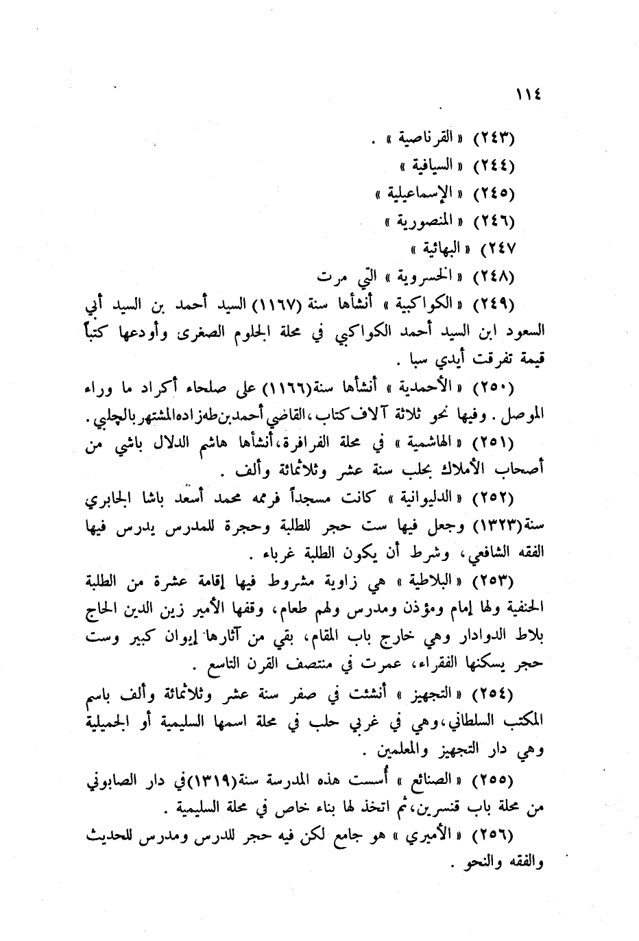 250 - الأحمدية أنشأها سنة 1166 على صلحاء أكراد ما وراء الموصل. وفيها نحو ثلاثة آلاف كناب، القاضي أحمد بن طه زاده المشتهر بالجلبي.