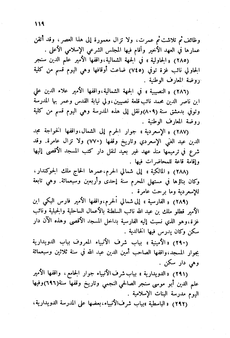 289 - الفارسية إلى شمالي الحرم، واقفها الأمير فارس البكي ابن الأمير قطلو ملك بن عبد الله نائب السلطة بالأعمال الساحلية والجبلية ونائب غزة، وهو الذي نسبت إليه الفارسية بداخل المسجد الأقصى وهذه الآن دار سكن وكان يدرس فيها الخالدية.
