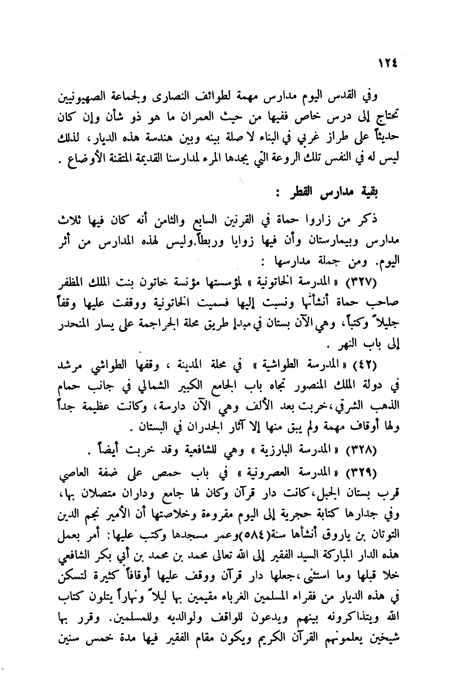 وفي القدس اليوم مدارس مهمة لطوائف النصارى ولجماعة الصهيونيين تحتاج إلى درس خاص ففيها من حيث العمران ما هو ذو شأن وإن كان حديثاً على طراز غربي في البناء لا صلة بينه وبين هندسة هذه الديار، لذلك ليس له في النفس تلك الروعة التي يجدها المرء لمدارسنا القديمة المتقنة الأوضاع.