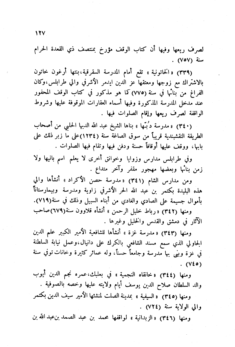 ومنها 342 رباط الخيل الرحمن أنشأها قلاوون سنة 679 صاحب الآثار في دمشق والقدس والخليل وغيرها.