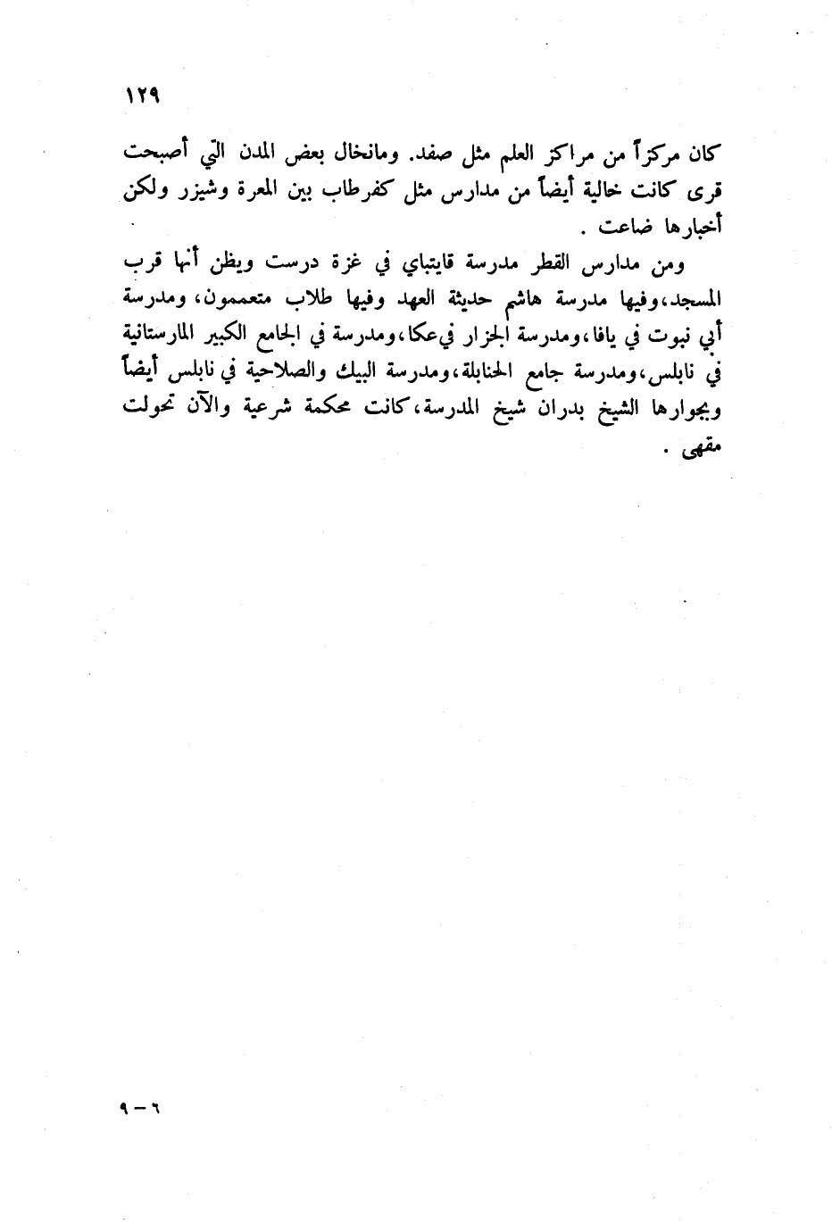 كان مركزاً من مراكز العلم مثل صفد. وما نخال بعض المدن التي أصبحت قرى كانت خالية أيضاً من مدارس مثل كفر طاب بين المعرة وشيزر ولكن أخبارها ضاعت.