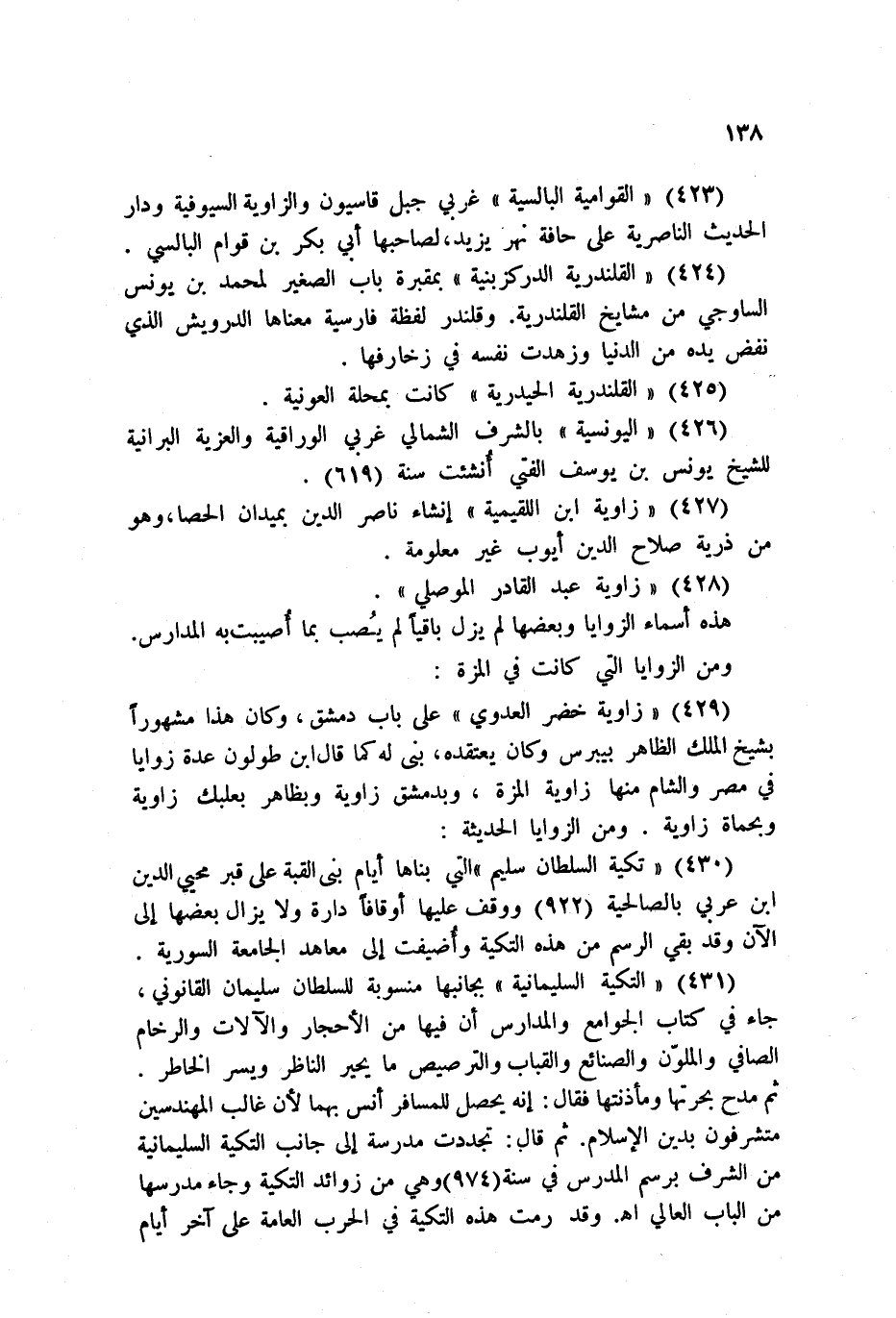 430 - تكية السلطان سليم التي بناها أيام بنى القبة على قبر محي الدين ابن عربي بالصالحية 922 ووقف عليها أوقافاً دارة ولا يزال بعضها إلى الآن وقد بقي الرسم من هذه التكية وأضيفت إلى معاهد الجامعة السورية.