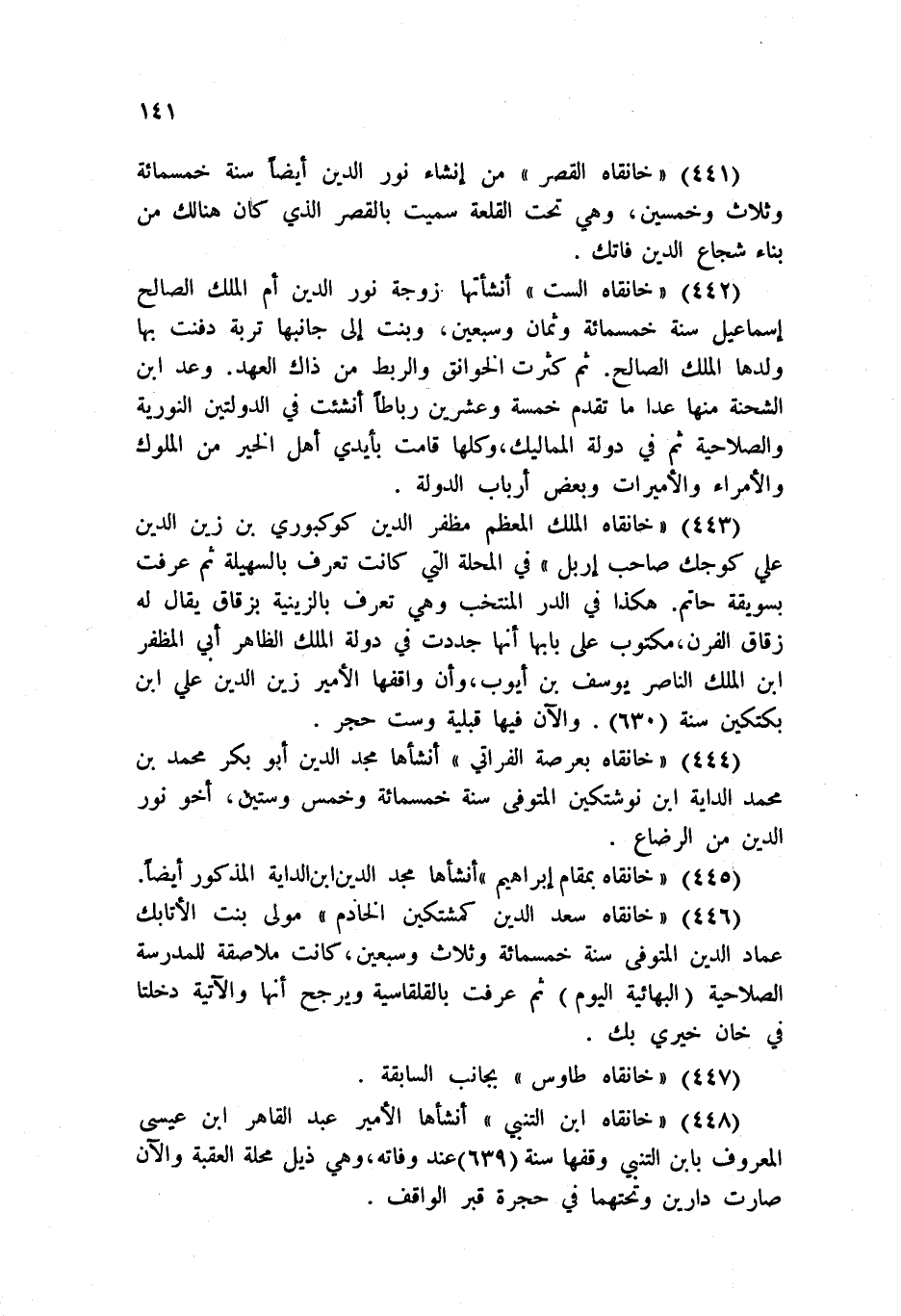 442 - خانقاه الست أنشأتها زوجة نور الدين أم الملك الصالح إسماعيل سنة خمسمائة وثمان وسبعين، وبنت إلى جانبها تربة دفنت بها ولدها الملك الصالح. ثم كثرت الخوانق والربط من ذاك العهد. وعد ابن الشحنة منها عدا ما تقدم خمسة وعشرين رباطاً أنشئت في الدولتين النورية والصلاحية ثم في دولة المماليك، وكلها قامت بأيدي أهل الخير من الملوك والأمراء والأميرات وبعض أرباب الدولة.