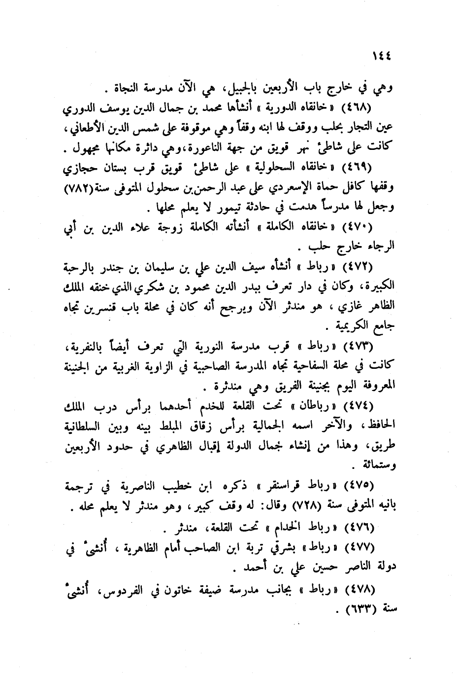 473 - رباط قرب مدرسة النورية التي تعرف أيضاً بالنفرية، كانت في محلة السفاحية تجاه المدرسة الصباحية في الزاوية الغربية من الجنينة المعروفة اليوم بجنينة الفريق وهي مندثرة.