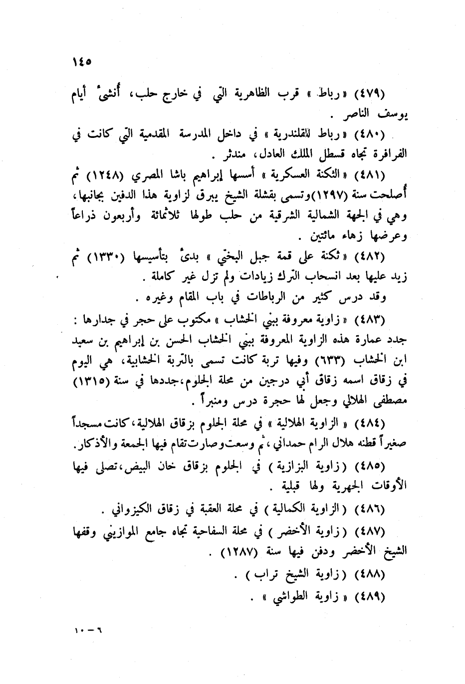 484 - الزاوية الهلالية في محلة الجلوم بزقاق الهلالية، كانت مسجدا صغيرا قطنه هلال الرام حمداني، ثم وسعت وصارت تقام فيها الجمعة والأذكار.