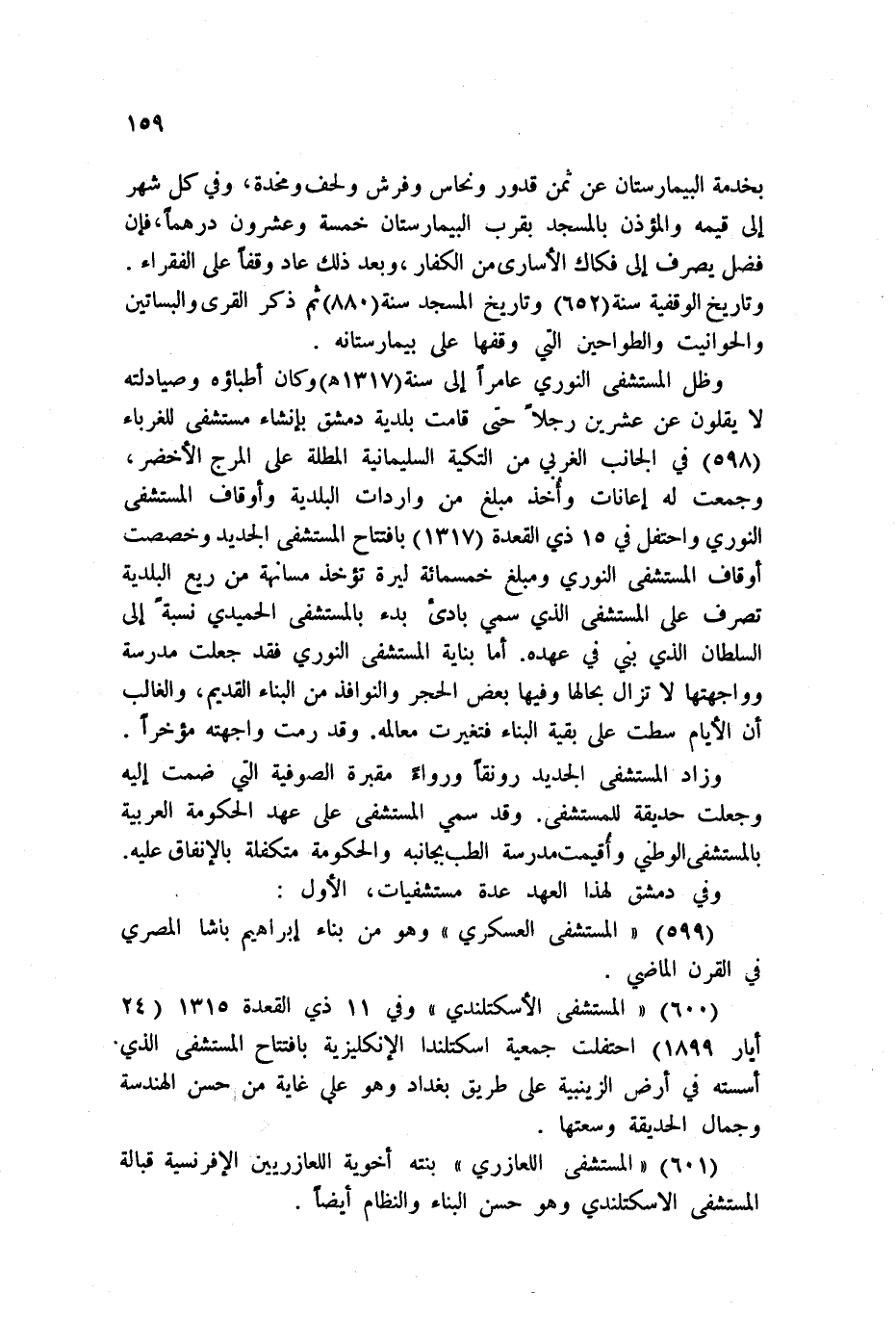 600 - المستشفى الإسكتلندي وفي 11 ذي القعدة 1315 24 أيار 1899 احتفلت جمعية اسكتلندا الإنكليزية بافتتاح المستشفى الذي أسسته في أرض الزينبية على طريق بغداد وهو على غاية من حسن الهندسة وجمال الحديقة وسعتها.