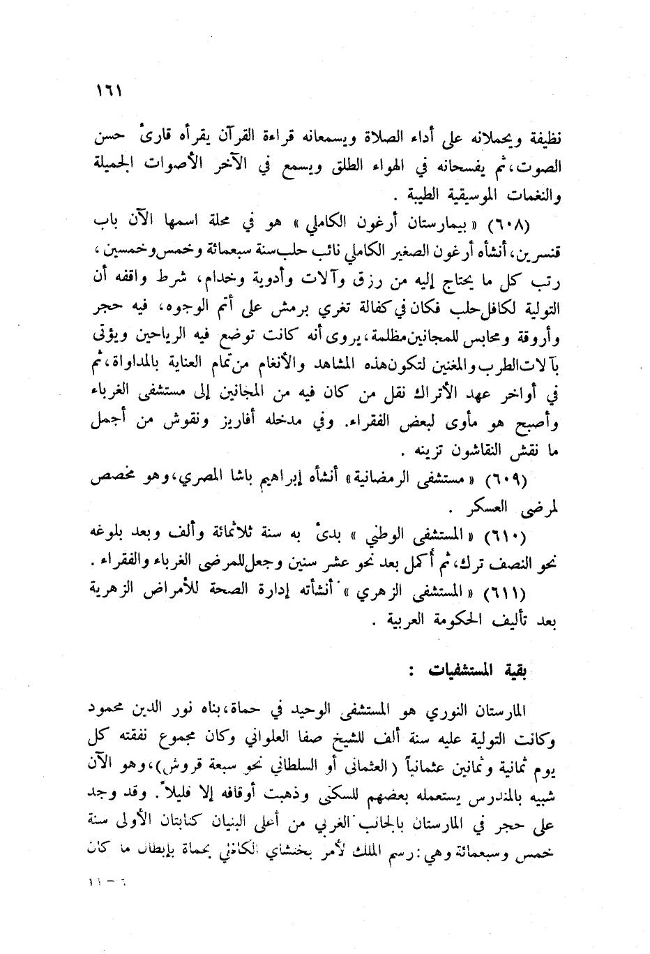 610 - المستشفى الوطني بدئ به سنة ثلاثمائة وألف وبعد بلوغه نحو النصف ترك، ثم أكمل بعد نحو عشر سنين وجعل للمرضى الغرباء والفقراء.