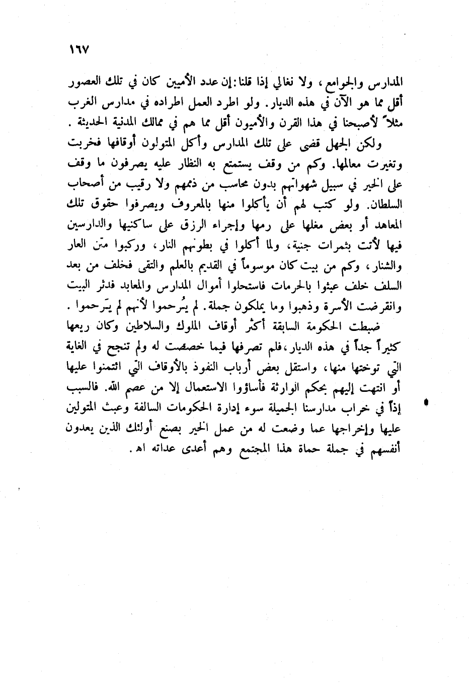 ولكن الجهل قضى على تلك المدارس وأكل المتولون أوقافها فخربت وتغيرت معالمها. وكم من وقف يستمتع به النظار عليه يصرفون ما وقف على الخير في سبيل شهواتهم بدون محاسب من ذممهم ولا رقيب من أصحاب السلطان. ولو كتب لهم أن يأكلوا منها بالمعروف ويصرفوا حقوق تلك المعاهد أو بعض مغلها على رمها وإجراء الرزق على ساكنيها والدارسين فيها لأتت بثمرات جنية، ولما أكلوا في بطونهم النار، وركبوا متن العار والشنار، وكم من بيت كان موسوماً في القديم بالعلم والتقى فخلف من بعد السلف خلف عبثوا بالحرمات فاستحلوا أموال المدارس والمعابد فدثر البيت وانقرضت الأسرة وذهبوا وما يملكون جملة. لم يرحموا لأنهم لم يرحموا.