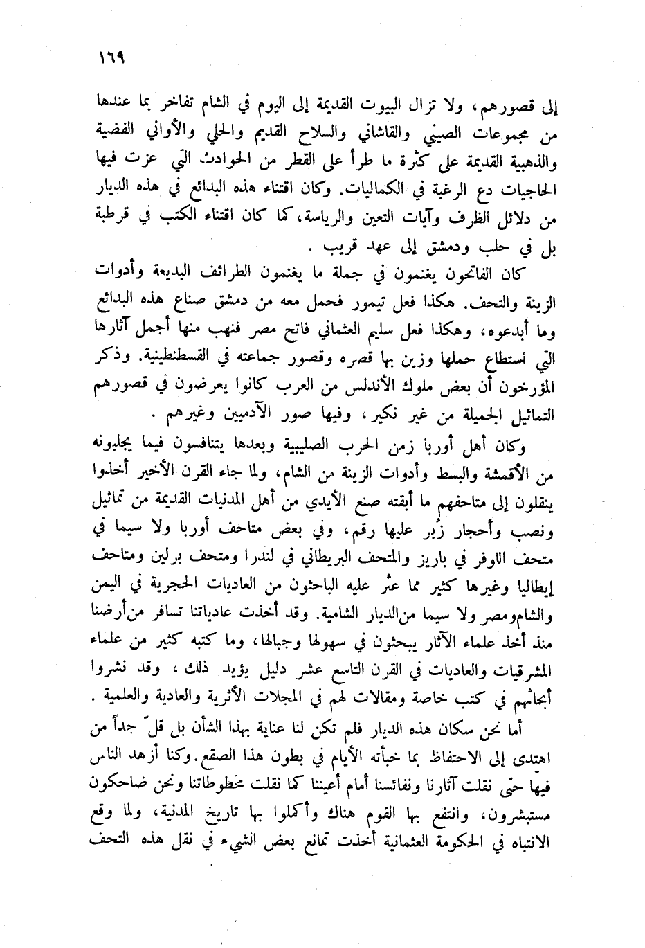 أما نحن سكان هذه الديار فلم تكن لنا عناية بهذا الشأن بل قل جداً من اهتدى إلى الاحتفاظ بما خبأته الأيام في بطون هذا الصقع. وكنا أزهد الناس فيها حتى نقلت آثارنا ونفسائسنا أمام أعيننا كما نقلت مخطوطاتنا ونحن ضاحكون مستبشرون،